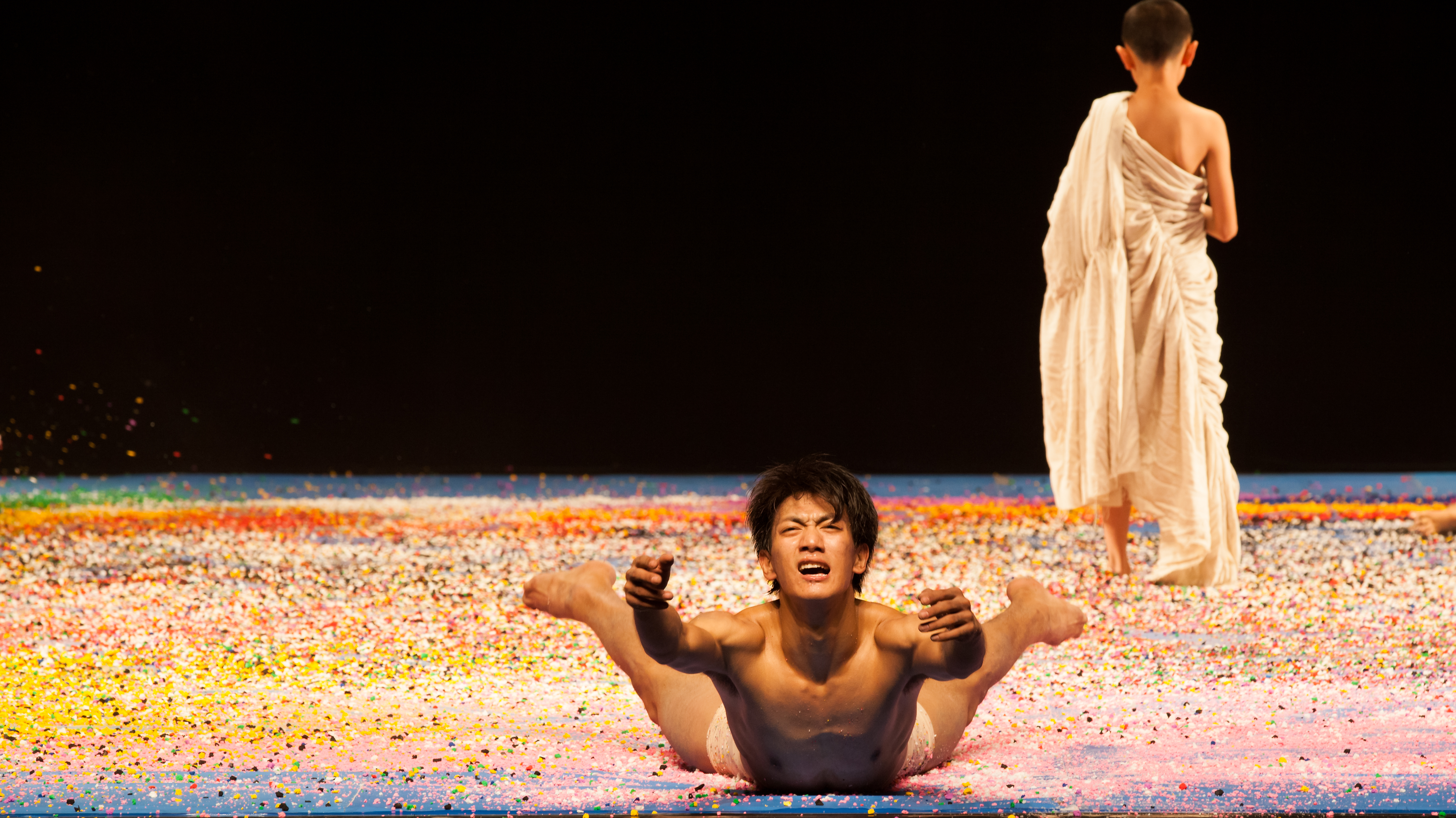 Ο χορός στην άμμο. Το σώμα γίνεται εργαλείο. Η άμμος εκτινάσσεται σαν βροχή — κίτρινη, μπλε, ροζ, λευκή. Όλα καταρρέουν, αλλά με τρόπο μαγικό, απελευθερωτικό.