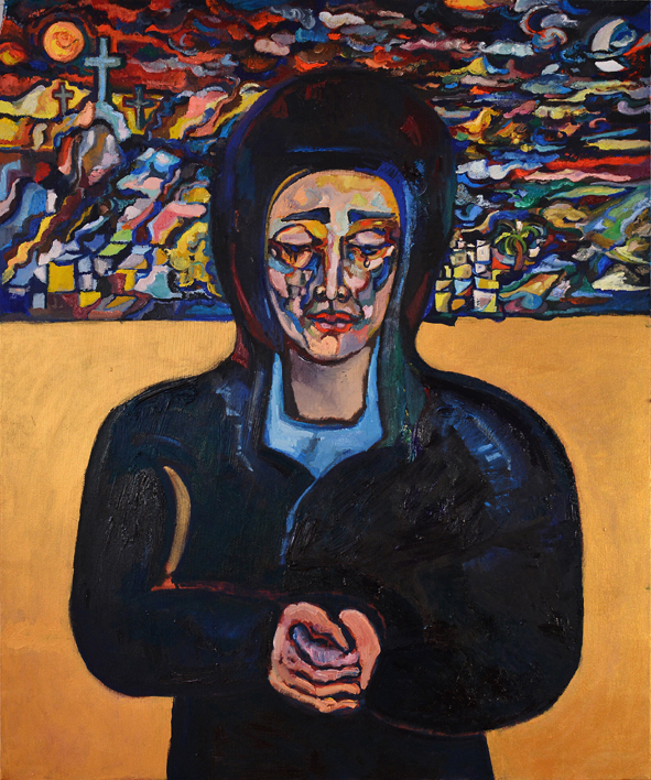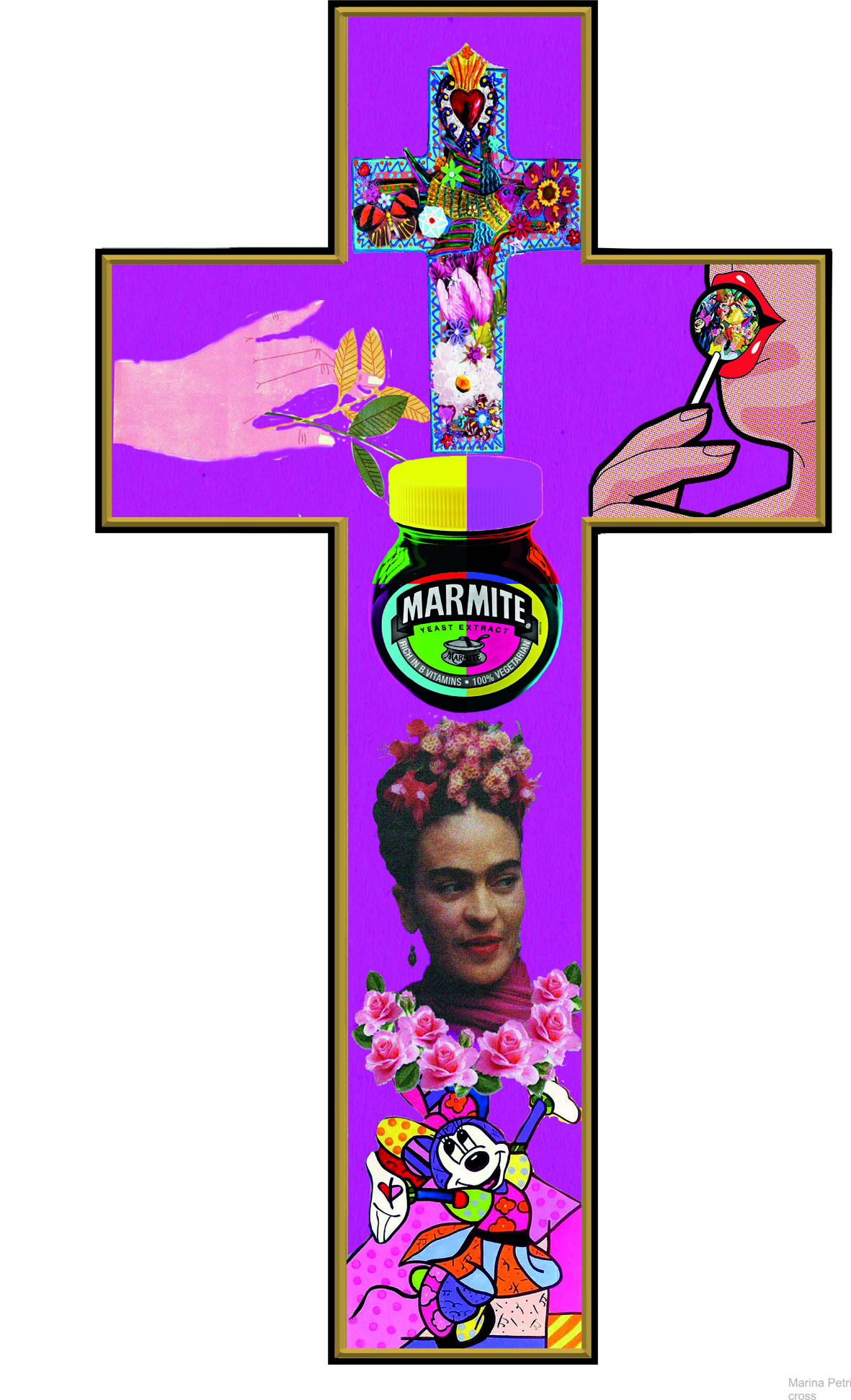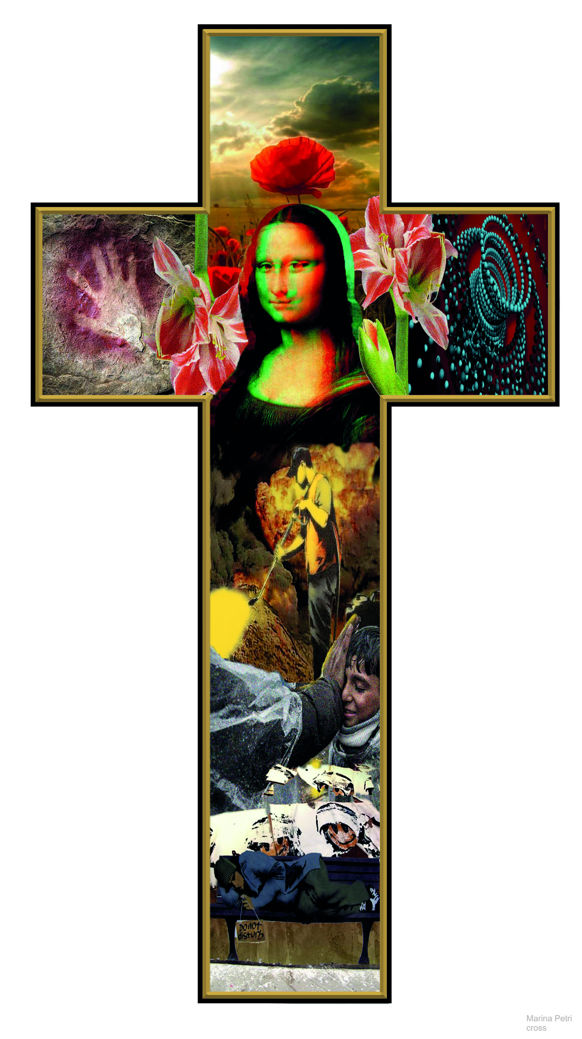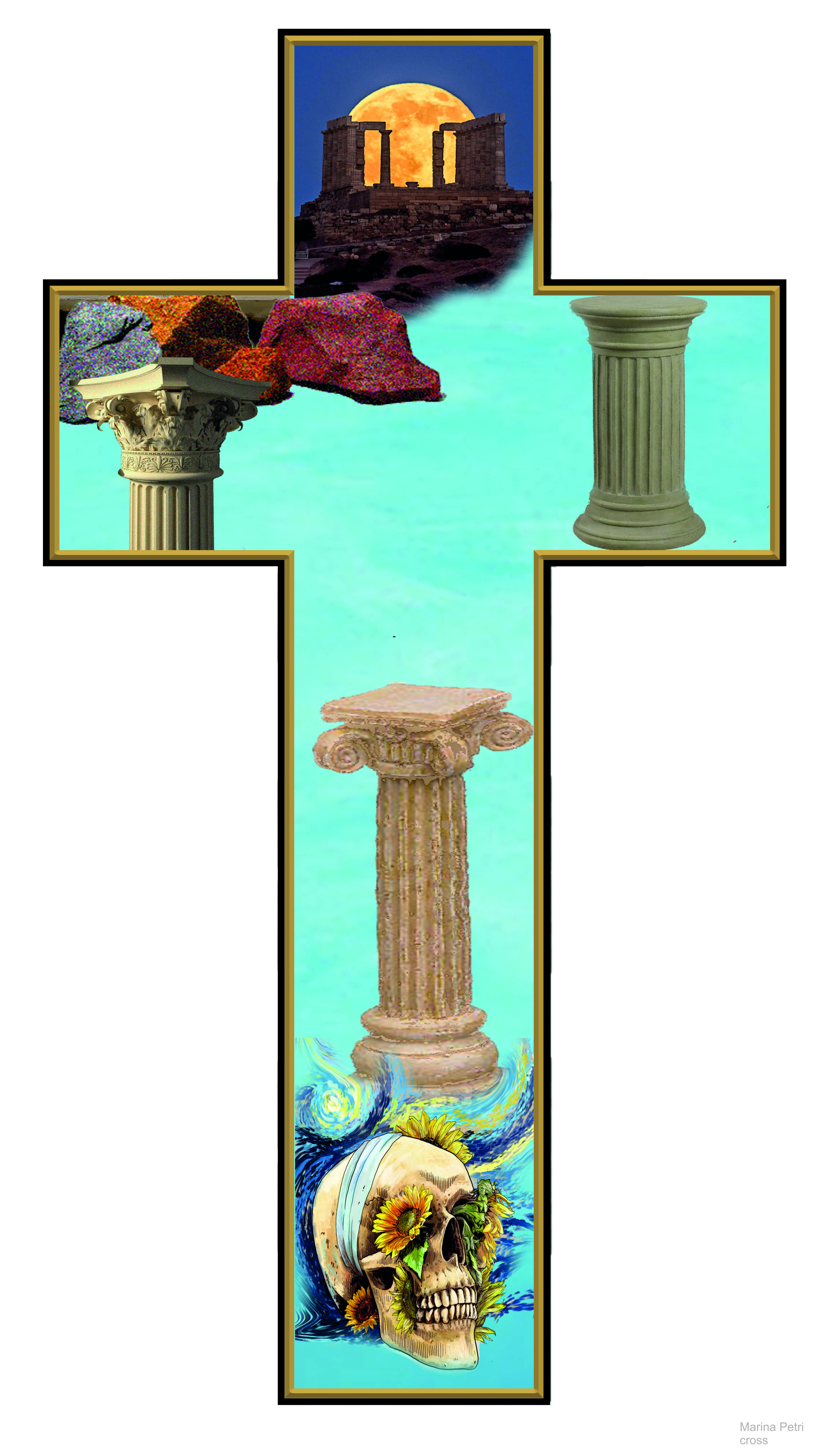 Γνώστης των μυστικιστικών σύμβολων, περνά μυσταγωγικά τον απόηχο της συμβολικής του Μεσαίωνα και της Αναγέννησης της σταύρωσης του Θεανθρώπου μέχρι την σταύρωση του σύγχρονου ανθρώπου με έναν ανορθόδοξο, αλλά οικείο σε όλους, τρόπο. Η ίδια έχει ζήσει κοντά στον κόσμο της εκκλησίας τα παιδικά της χρόνια στην Μύκονο όπου όλα τα σημαντικά γεγονότα της ζωής, η γιορτή, η γέννα, ο γάμος, η κηδεία και το μνημόσυνο είναι μέρος της καθημερινότητας. Ψέλνοντας δίπλα στον παππού της Νικόλαο, θα περάσει στη διάρκεια των σπουδών της τα ρηξικέλευθα χρόνια της μεταπολίτευσης και θα συνεχίσει σπουδές και ζωή στο Λονδίνο και Βερολίνο με την ροκ επανάσταση και τα επακόλουθα της περιόδου της πτώσης του Τείχους του Βερολίνου. Συμμετέχοντας στις αλλαγές αυτών των χρόνων κατανοεί ότι η εικόνα αλλάζει, αλλά ποτέ το βαθύτερο σύμβολο. Η αρχέγονη σημειολογία της σταύρωσης είναι εμφανής σε πολλά από τα έργα της όπως το μικρό ασπρόμαυρο σχέδιο Cross in boa, όπου η σύνθεση της φιγούρας του Χριστού που κουβαλά τον σταυρό του περικλείεται μέσα στο σχήμα μιας βάρκας, δηλαδή του ναού, αφού η λέξη προέρχεται από το νέω = ταξιδεύω και την ναύς δηλαδή το πλεούμενο. Στο έργο της «θλίψη» όπου η Πανάγια Μαρία απομακρύνεται από το κατακερματισμένο κυβιστικό τοπίο που περιγράφει το τοπίο της Σταύρωσης μετά την Αποκαθήλωση, περικλειόμενη από ένα φαλλικό σχήμα που περνά σε ένα χρυσωμένο άδειο επίπεδο το τοπίο, ο κατακερματισμός του οποίου γράφει το πρόσωπό της.