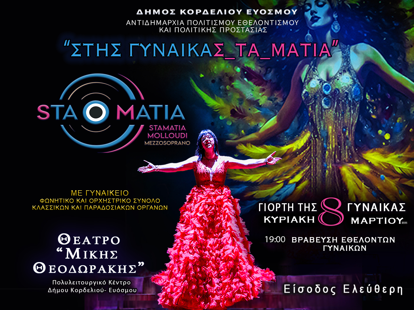 Με αφορμή την Παγκόσμια Ημέρα της Γυναίκας, ο Δήμος Κορδελιού – Ευόσμου παρουσιάζει τη μουσική παράσταση «ΣΤΗΣ ΓΥΝΑΙΚΑΣ_ΤΑ_ΜΑΤΙΑ», της StaMatia (Mezzo Soprano Σταματία Μολλούδη), μια βραδιά αφιερωμένη στη γυναικεία εμπειρία: τη δύναμη και την ευαισθησία, τον έρωτα και την απώλεια, την αντοχή και την πληγή — τη γυναίκα που πέφτει και ξανασηκώνεται.