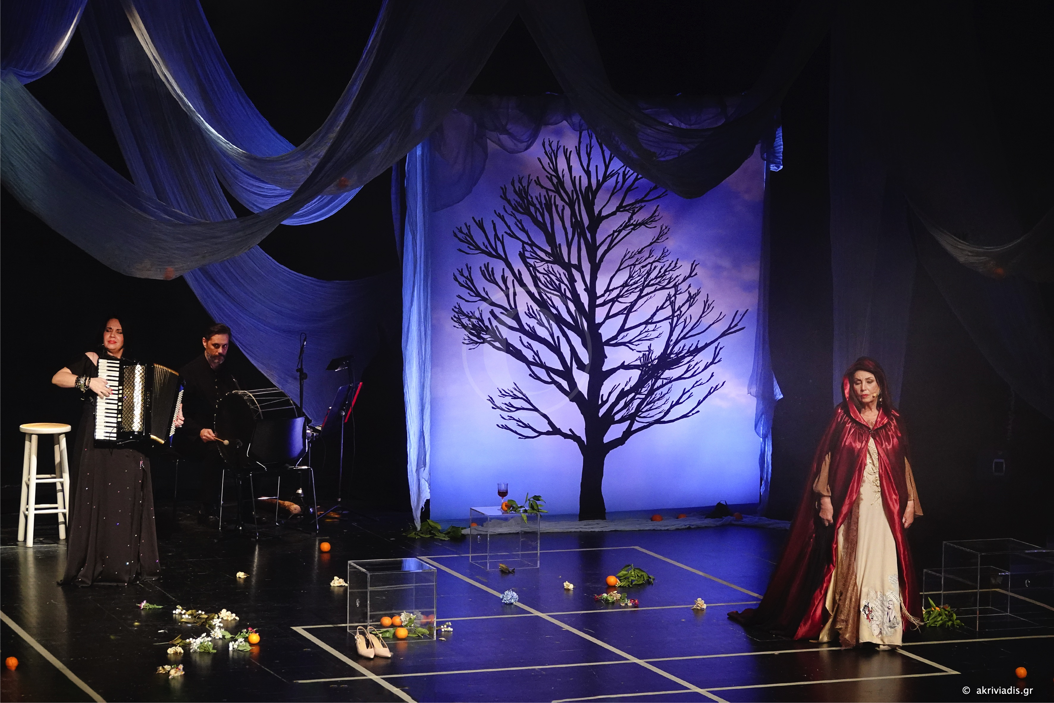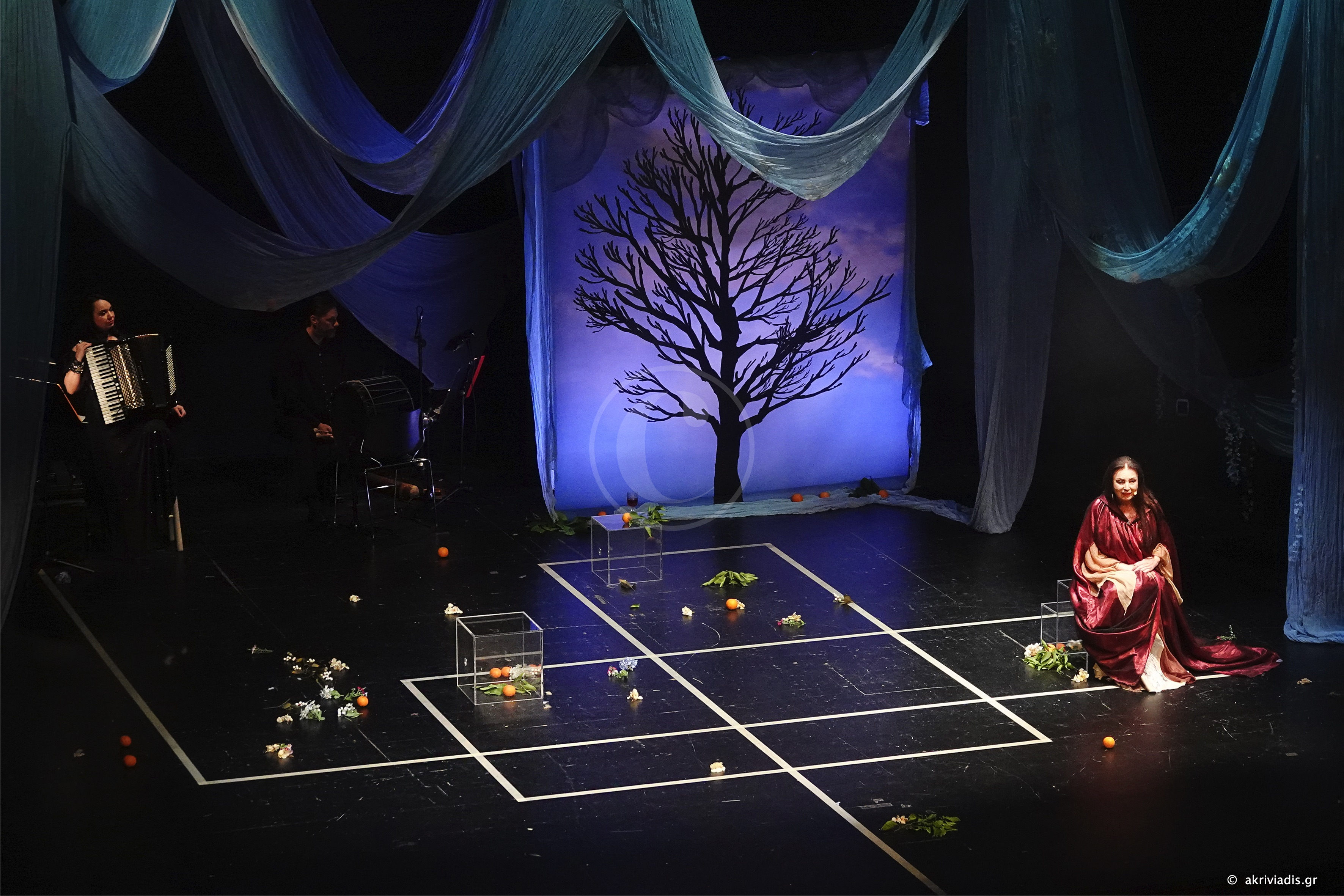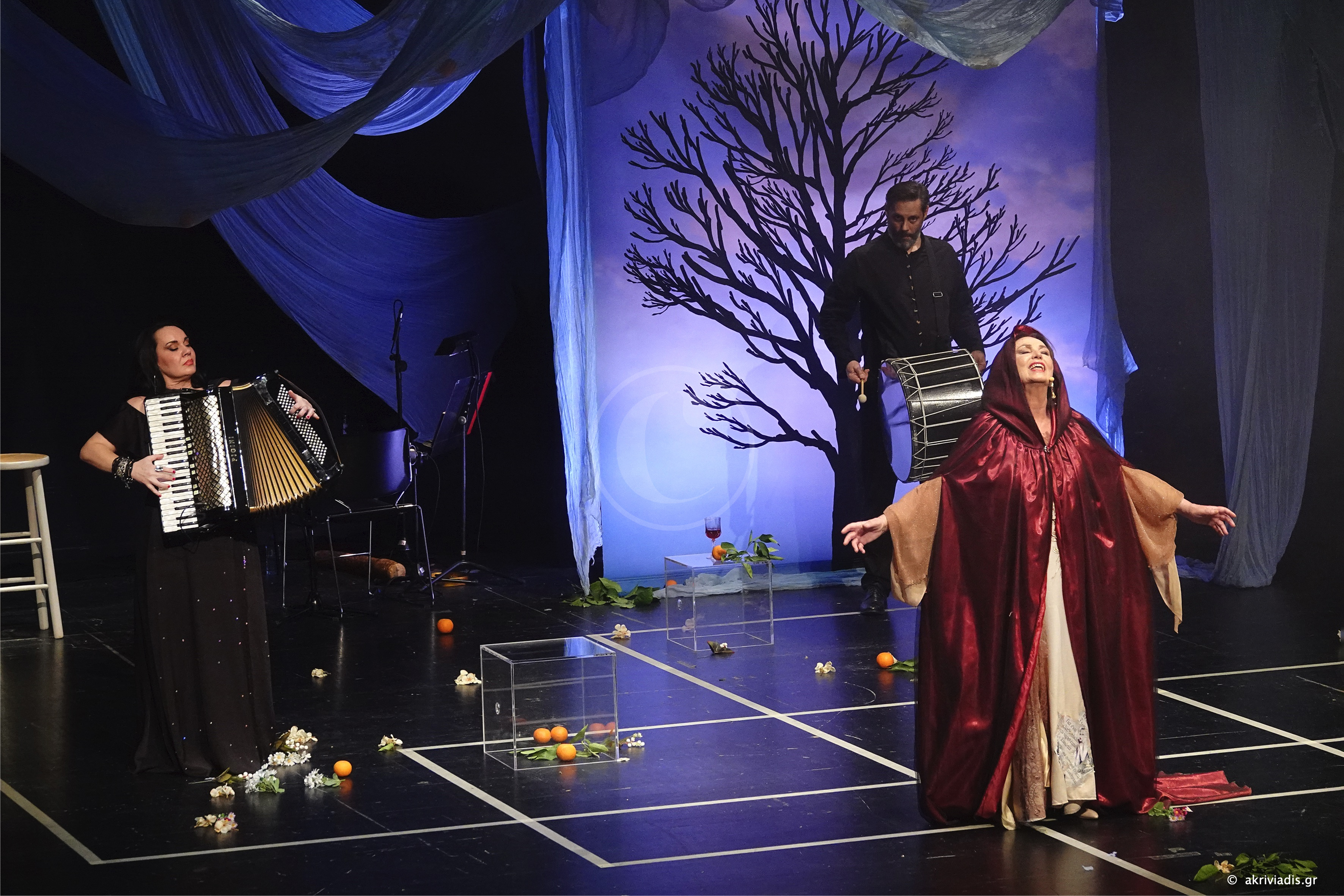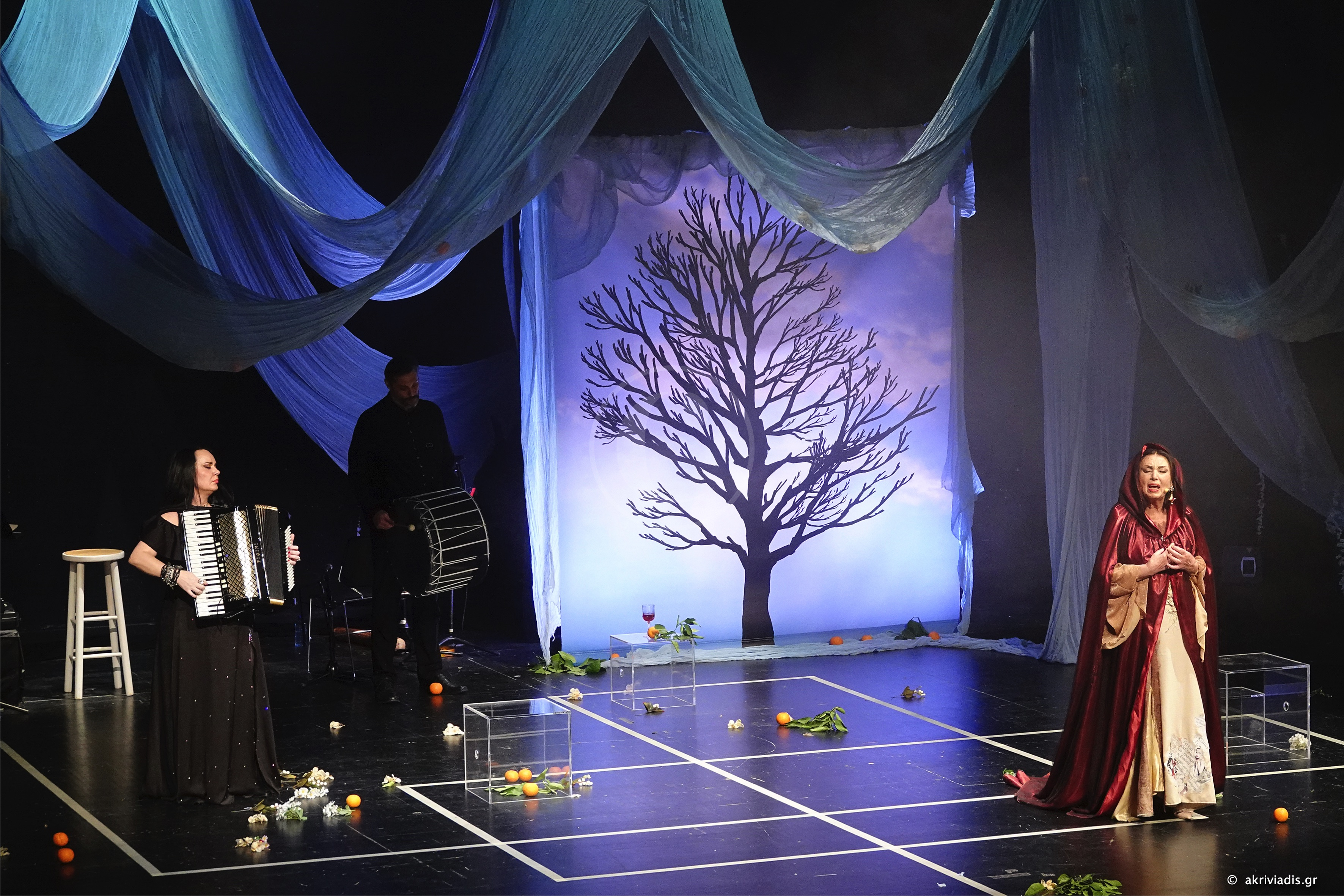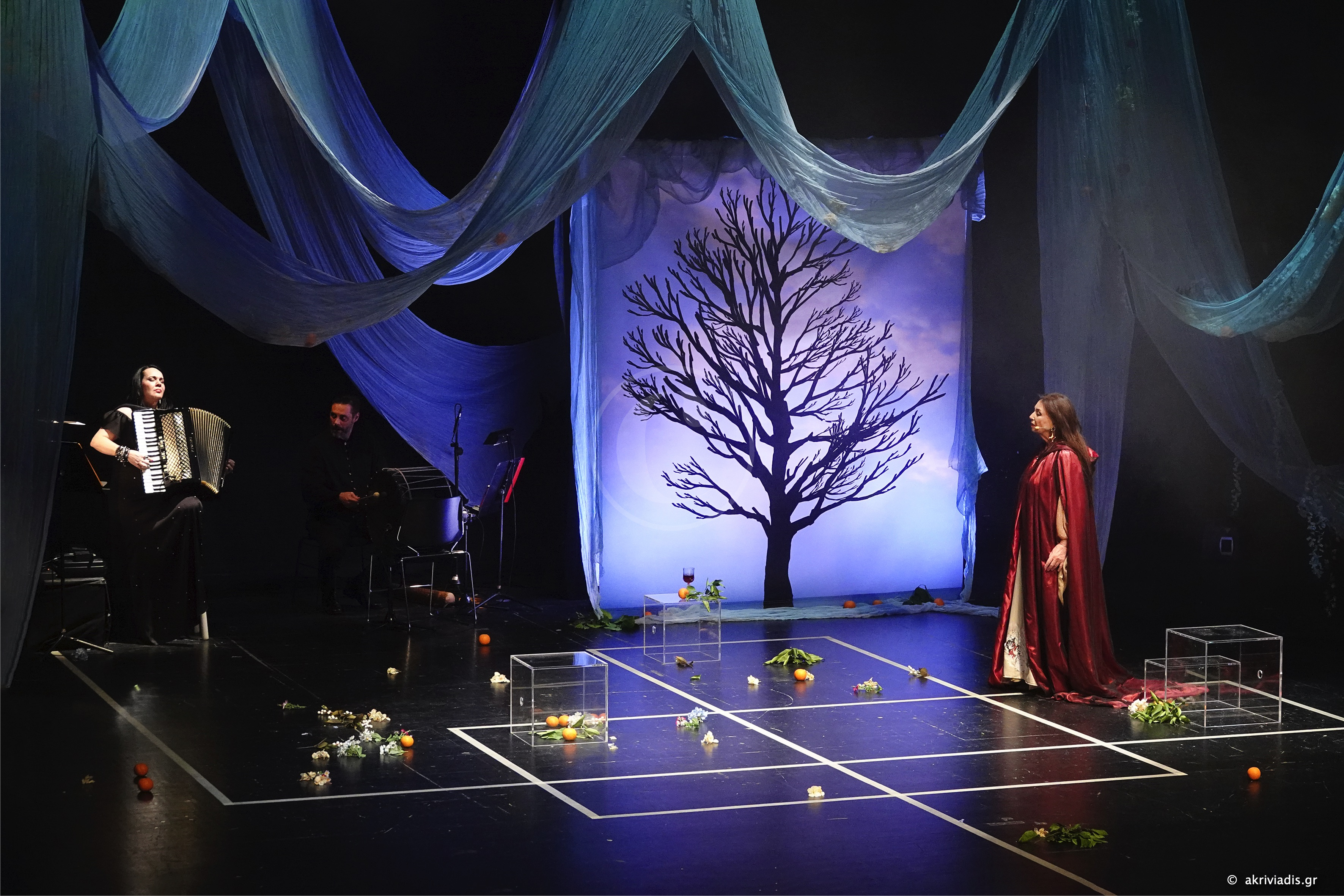 Η Ζωή Τηγανούρια, ταλαντούχα βιρτουόζος του ακορντεόν, υπογράφει την πρωτότυπη μουσική και εμφανίστηκε επί σκηνής μαζί με τον Στέλιο Γενεράλη στα κρουστά. Μέσα από μοιρολόγια, τραγούδια έρωτα, ύμνους αντίστασης και έναν συγκλονιστικό τελικό ύμνο στην Ειρήνη, λόγος και μουσική ενώθηκαν σε ένα συναισθηματικό ταξίδι γεμάτο ένταση, συγκίνηση, θυμό, χιούμορ, τρυφερότητα και πάθος. Στην παράσταση ακούστηκαν σημαντικά παραδοσιακά τραγούδια, όπως “Ξένος εδώ, ξένος εκεί” και “Τι έχεις καημένη κόρη”, τα οποία ερμήνευσε η Γεωργία Ζώη, προσδίδοντας μια βαθιά λαϊκή και συλλογική μνήμη στο μονόλογο.