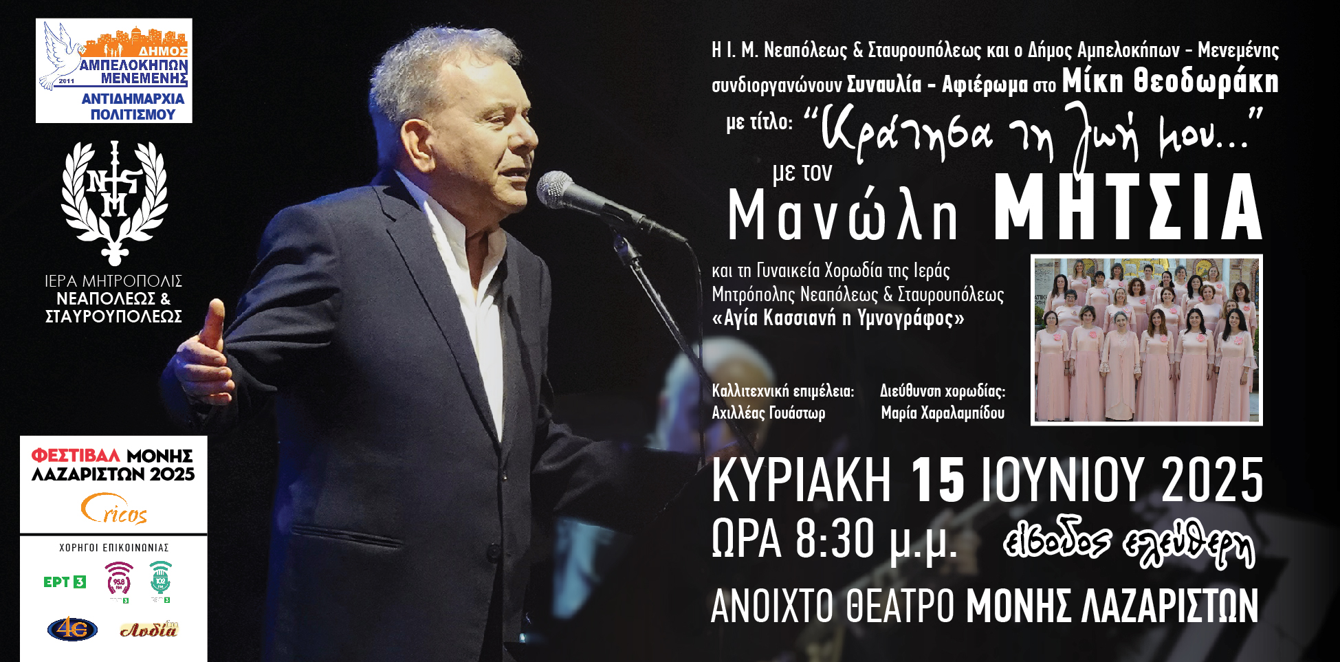 Η Ιερά Μητρόπολη Νεαπόλεως και Σταυρουπόλεως και ο Δήμος Αμπελοκήπων – Μενεμένης συνδιοργανώνουν μια μεγάλη συναυλία-αφιέρωμα, προς τιμήν του σπουδαίου Έλληνα συνθέτη Μίκη Θεοδωράκη με τίτλο “Κράτησα τη ζωή μου…”, την Κυριακή 15 Ιουνίου, στις 20:30, με ελεύθερη είσοδο στο πλαίσιο του Φεστιβάλ Μονής Λαζαριστών 2025.