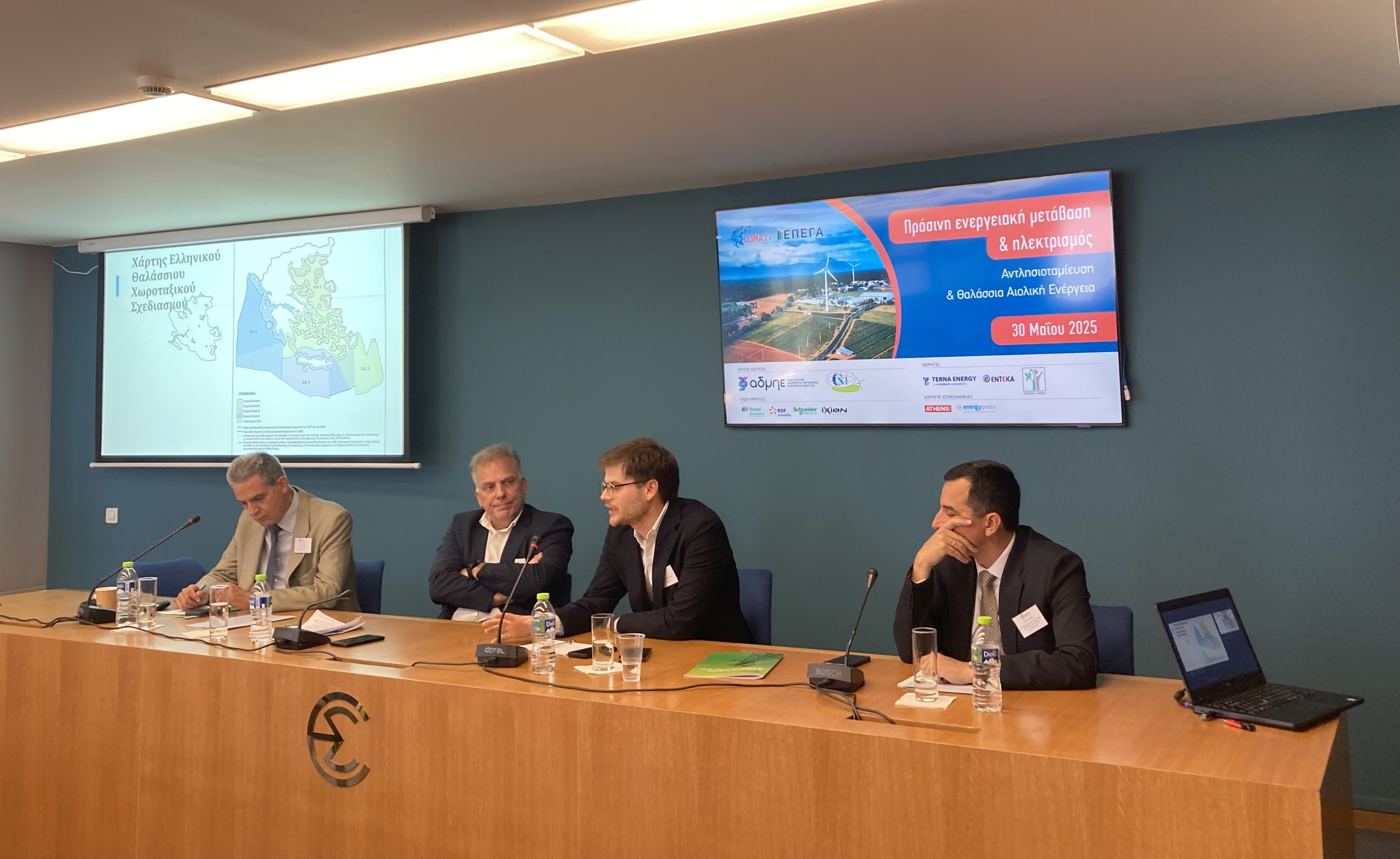 Η δεύτερη ενότητα της ημερίδας, κινήθηκε σε …πιο βαθειά νερά αφού το ζήτημα που συζητήθηκε είναι από μόνο του δύσκολο και δυσεπίλυτο, όσο και κρίσιμο για το μέλλον της πράσινης ενέργειας και όχι μόνον. Το εν λόγω θέμα ήταν τα Θαλάσσια (ή Υπεράκτια) Αιολικά Πάρκα (ΘΑΠ) τα οποία έχουν εξαγγελθεί εδώ και είκοσι περίπου χρόνια, αλλά τα απαραίτητα και συγκεκριμένα βήματα αναβάλλονται, παρά το ότι μεσολάβησαν 5 διαδοχικές κυβερνήσεις. Ο λόγος; Η αναβολή κήρυξης ΑΟΖ στο Αιγαίο έτσι ώστε οι (πλωτές) ανεμογεννήτριες να εκμεταλλευτούν με τον καλύτερο τρόπο τους ανέμους των ανοιχτών θαλασσών. Όμως, η αναβλητικότητα, ενώ κατ’ αρχήν μπορεί να φαίνεται ως στάση σωφροσύνης, μπορεί τελικά να αποβεί εις βάρος μας, αν η Τουρκία αποφασίσει να προωθήσει τα δικά της σχέδια για διεκδίκηση μέρους των επίμαχων θαλάσσιων ενεργειακών πόρων και κυρίως των ΑΠΕ. Ο εκ των εισηγητών Άγγελος Συρίγος, τέως υφυπουργός και καθηγητής Διεθνούς Δικαίου & Εξωτερικής Πολιτικής στο Πάντειο Πανεπιστήμιο, ήταν ξεκάθαρος: η Ελλάδα πρέπει να κάνει τώρα των πρώτη κίνηση και να κηρύξει την ΑΟΖ (Αποκλειστική Οικονομική Ζώνη) στο Αιγαίο, ανεξάρτητα από τις εισηγήσεις και τις τεχνικές και διπλωματικές ενέργειες που θα ακολουθήσουν για την οριοθέτηση, που είναι το επόμενο βήμα. Ο χρόνος όμως που περνάει, δεν είναι σίγουρα ούτε υπέρ των εθνικών συμφερόντων ούτε υπέρ της αξιοποίησης του τεράστιου αιολικού δυναμικού των θαλασσών. Αυτό που δεν γίνεται όμως στο Αιγαίο και γενικότερα στη Μεσόγειο, υλοποιείται κατά εντυπωσιακό τρόπο στη Βόρειο Θάλασσα με τη διακρατική συνεργασία και τα υπεράκτια δίκτυα που μοιράζουν την ηλεκτρική ενέργεια σε μια νέα αγορά που γεωγραφικά εκτείνεται από την Αγγλία μέχρι τη Βαλτική, αλλά εν τέλει αφορά ολόκληρη την Ευρώπη.