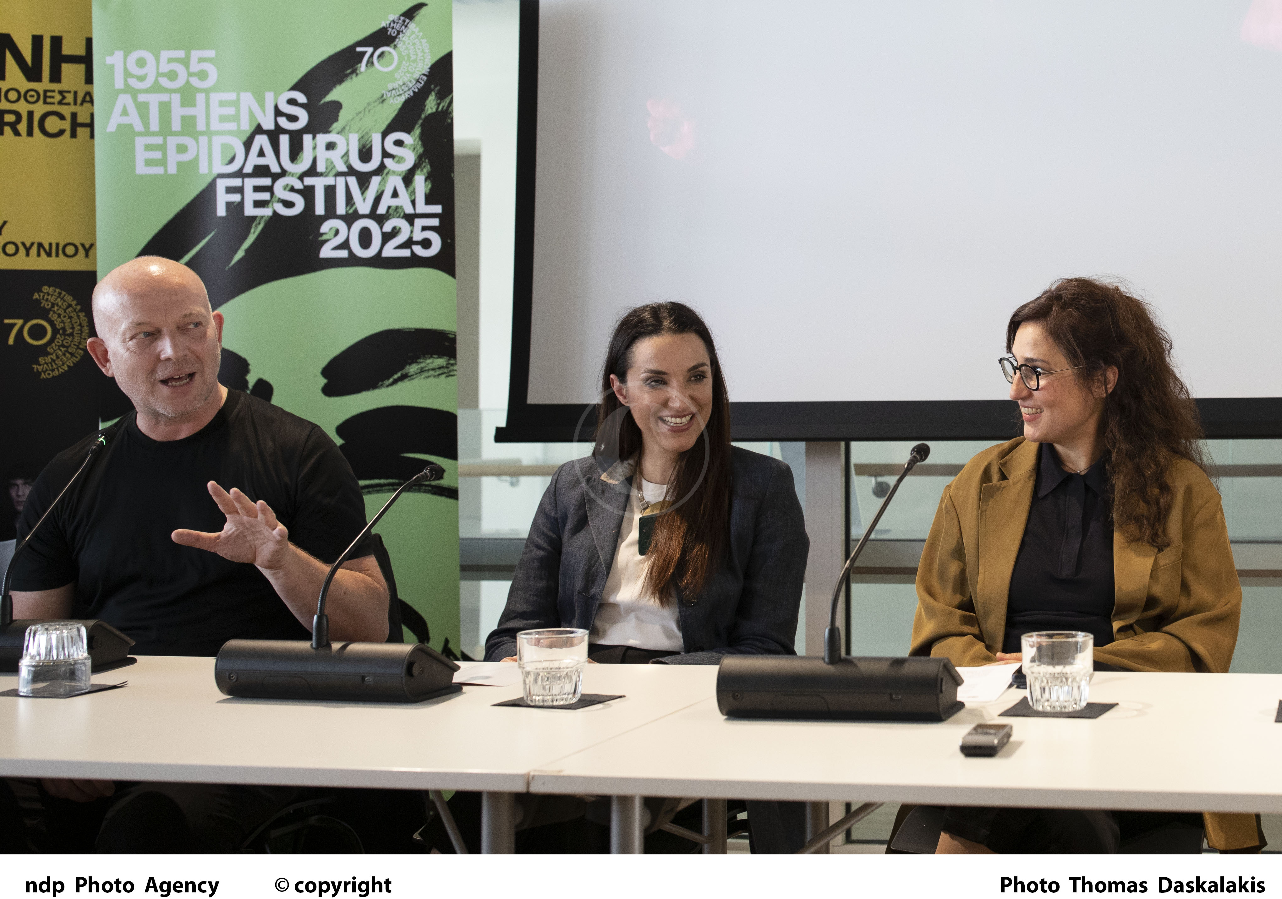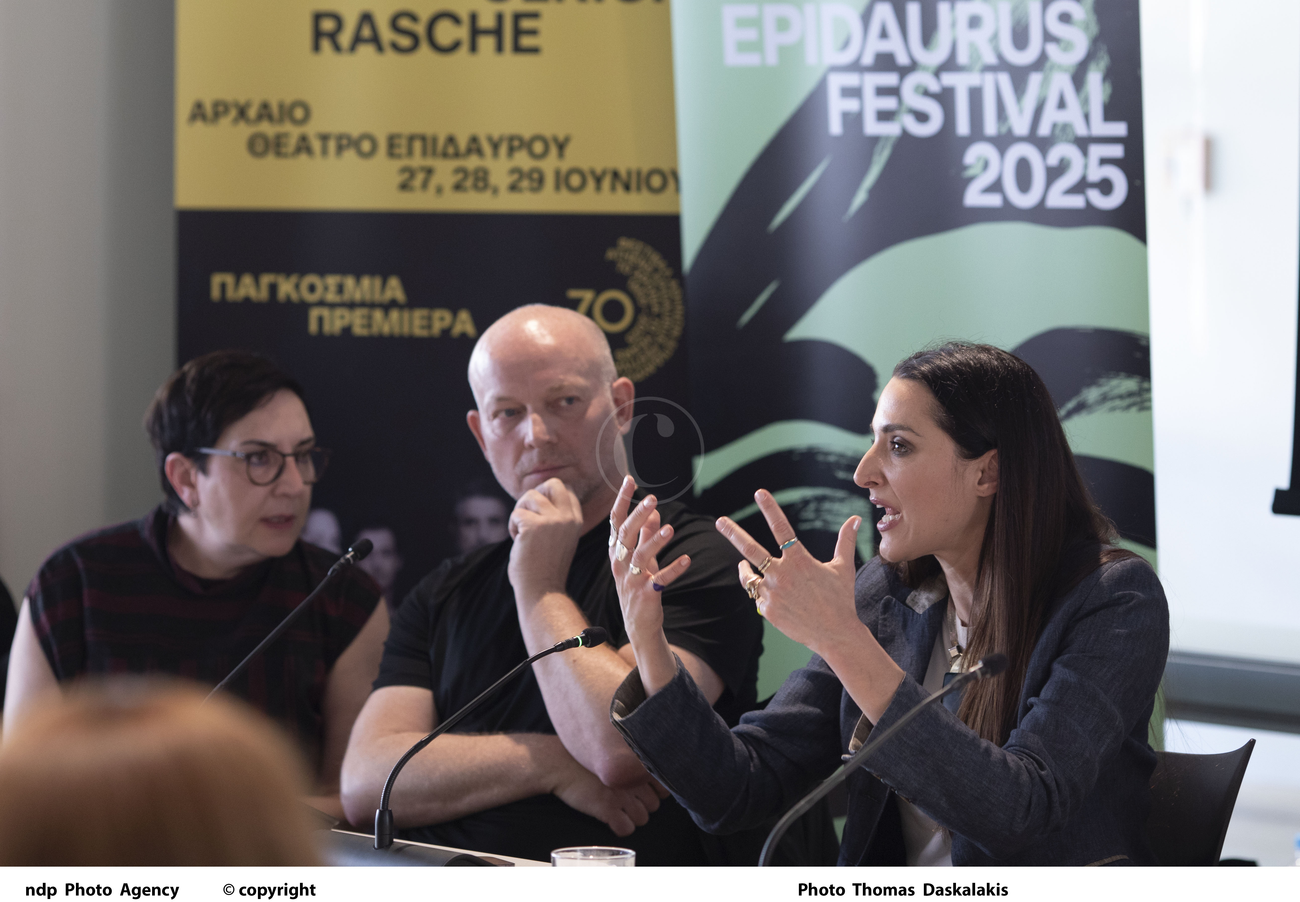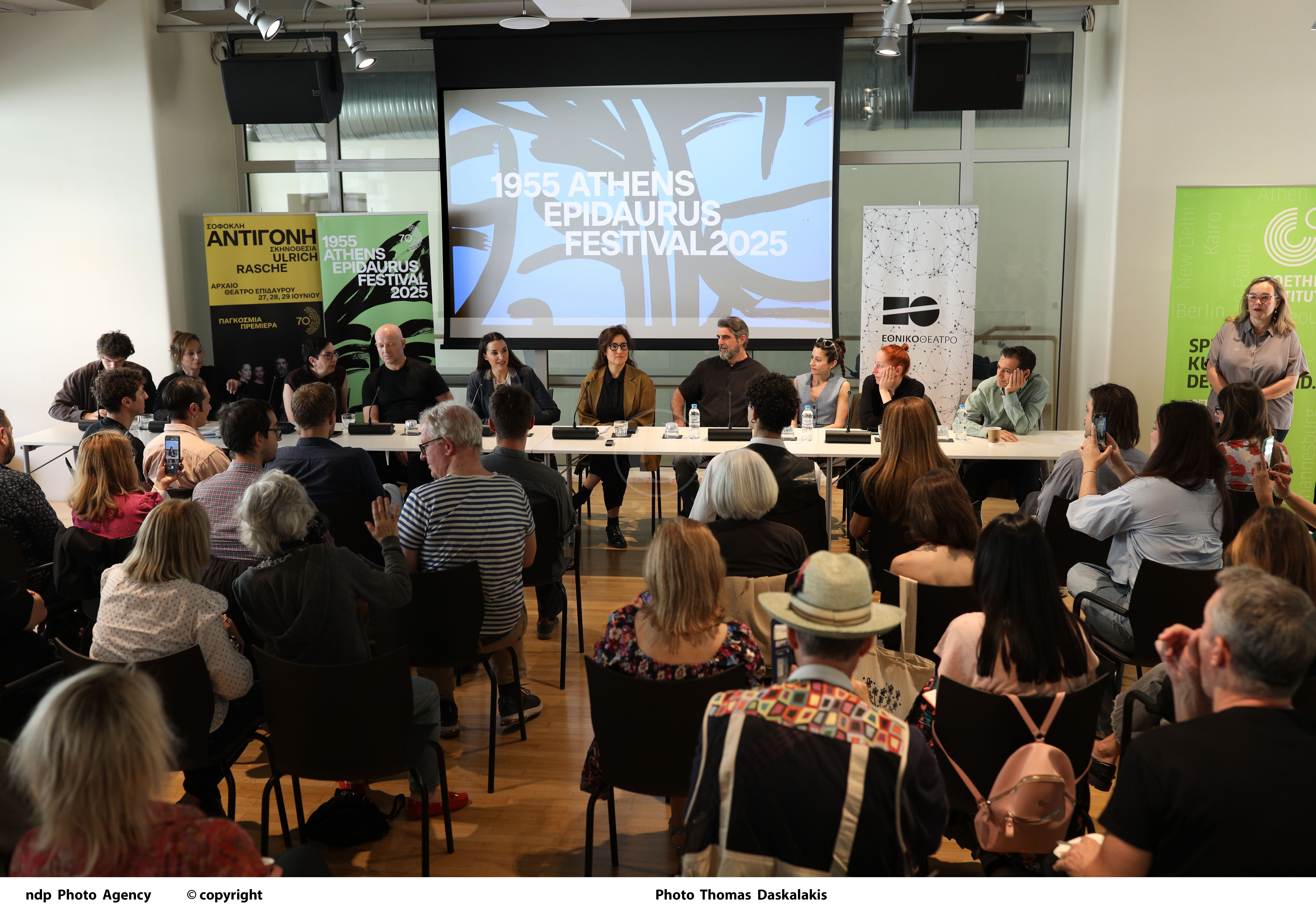 Ανοίγοντας τη συζήτηση η Καλλιτεχνική Διευθύντρια του Φεστιβάλ Αθηνών Επιδαύρου Κατερίνα Ευαγγελάτου τόνισε τη σημαντικότητα της συνεργασίας με το Εθνικό Θέατρο, την κορυφαία θεατρική σκηνή της χώρας και έναv από τους βασικούς πυλώνες του Φεστιβάλ. «Αισθάνομαι χαρούμενη και τυχερή που το φετινό επετειακό Φεστιβάλ ανοίγει με μια τέτοια θεσμική και καλλιτεχνική σύμπραξη και με το συγκεκριμένο σύνολο συντελεστών που αποτελείται από την αφρόκρεμα Ελλήνων και Ελληνίδων ηθοποιών όλων των γενεών» είπε αναφερόμενη στην Αντιγόνη.Στη συνέχεια, τόνισε ότι η παράσταση θα ανέβει αποκλειστικά στην Επίδαυρο και σχολίασε ότι από την αρχή της πορείας της επεδίωξε με τους συνεργάτες της την παραγωγή καλλιτεχνικών έργων που παρουσιάστηκαν είτε αποκλειστικά -είτε με μικρή περιοδεία-στο Φεστιβάλ,ώστε να υπογραμμιστεί η μοναδικότητά του.Κλείνοντας,αναφέρθηκε στον στόχο του Φεστιβάλ Αθηνών Επιδαύρου για συστηματική πρόσκληση σε σημαντικούς διεθνείς σκηνοθέτες, με ιδιαίτερο καλλιτεχνικό στίγμα, ώστε να εργαστούν με ελληνικούς θιάσους. Φέτος, με τον Ούλριχ Ράσε στην Αντιγόνη, είναι η τρίτη χρονιά που πραγματοποιείται αυτή η σύμπραξη, ενώ είχαν προηγηθεί ο Φρανκ Κάστορφ το 2023 και ο Τιμοφέι Κουλιάμπιν το 2024.