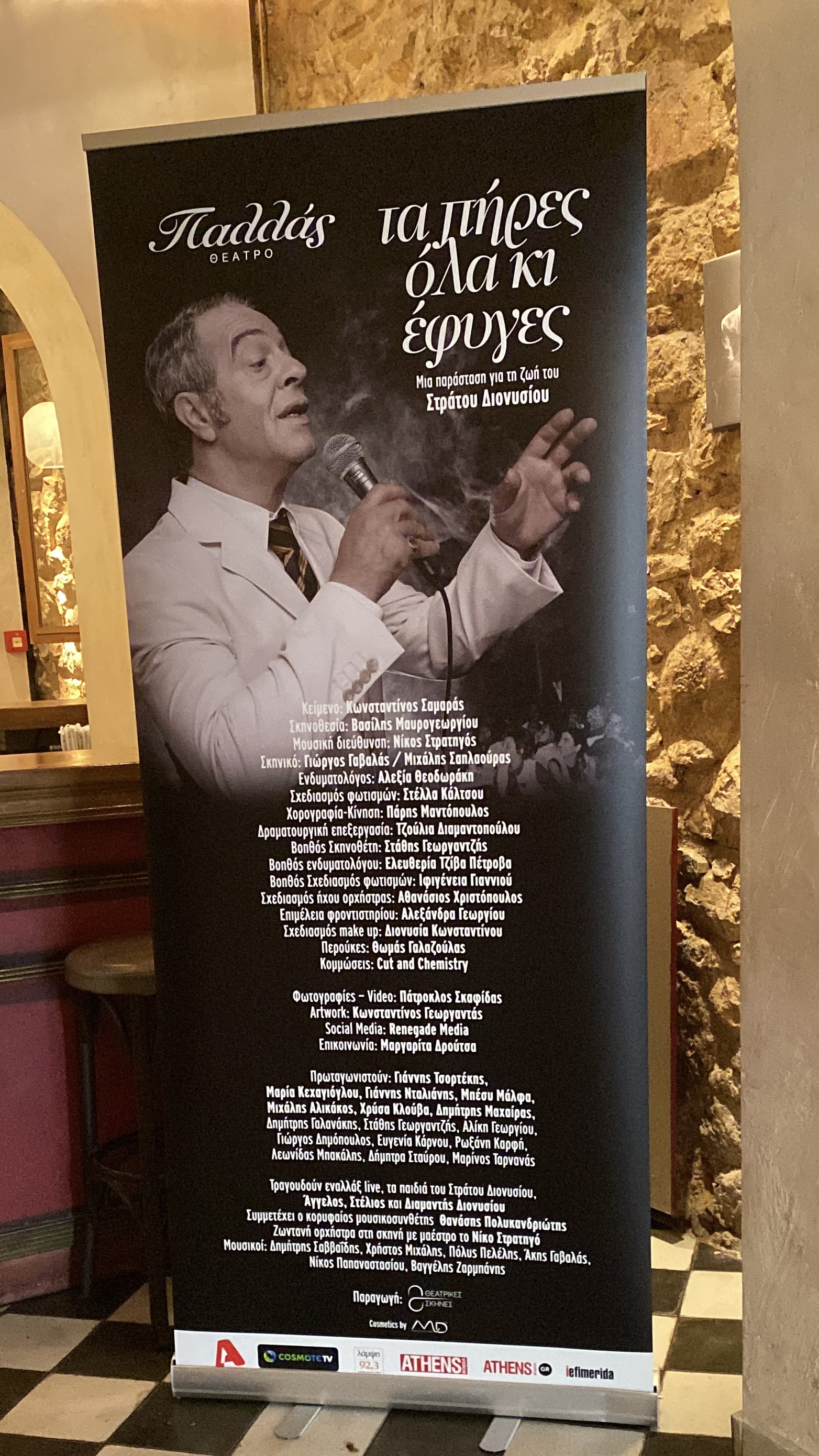 «Δεν είμαι conferancier, δεν ειμαι τραγουδιστής, μάλλον πρέπει να παίζω καλό μπουζούκι και έτσι θα ξεκινήσει η παράσταση» είπε αστειευόμενος ο Θανάσης Πολυκανδριώτης που εξήρε τα κείμενα και τους συντελεστές της παράστασης ενώ μοιράστηκε στιγμές από την προσωπική του σχέση με τον Στράτο Διονυσίου. «Τα πήρε όλα κι έφυγε» είπε χαρακτηριστικά«όταν έφυγε από τη ζωή, η νυχτερινή ζωή φτώχυνε και μαζί όλοι εμείς που αγαπάμε το λαϊκό τραγούδι».