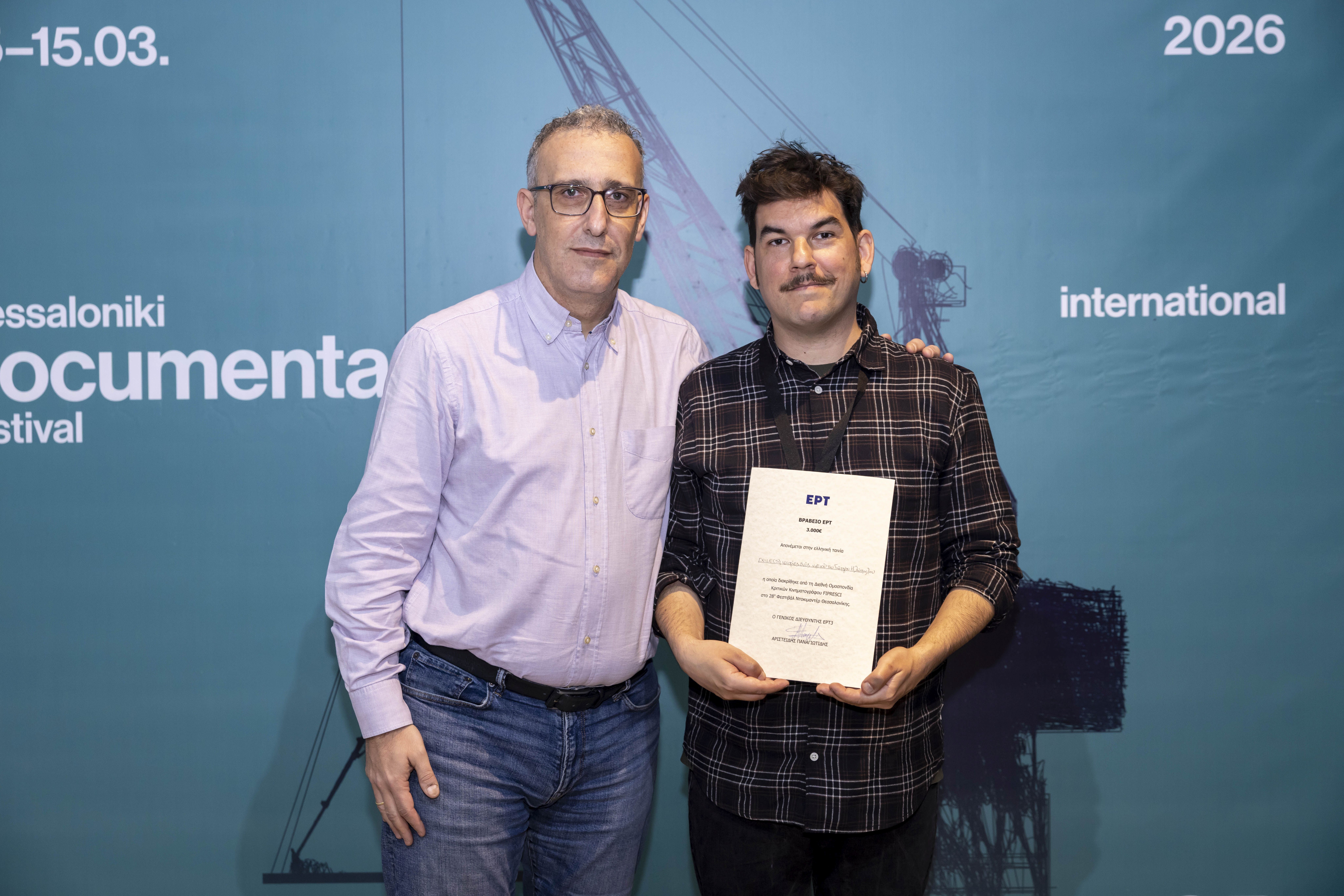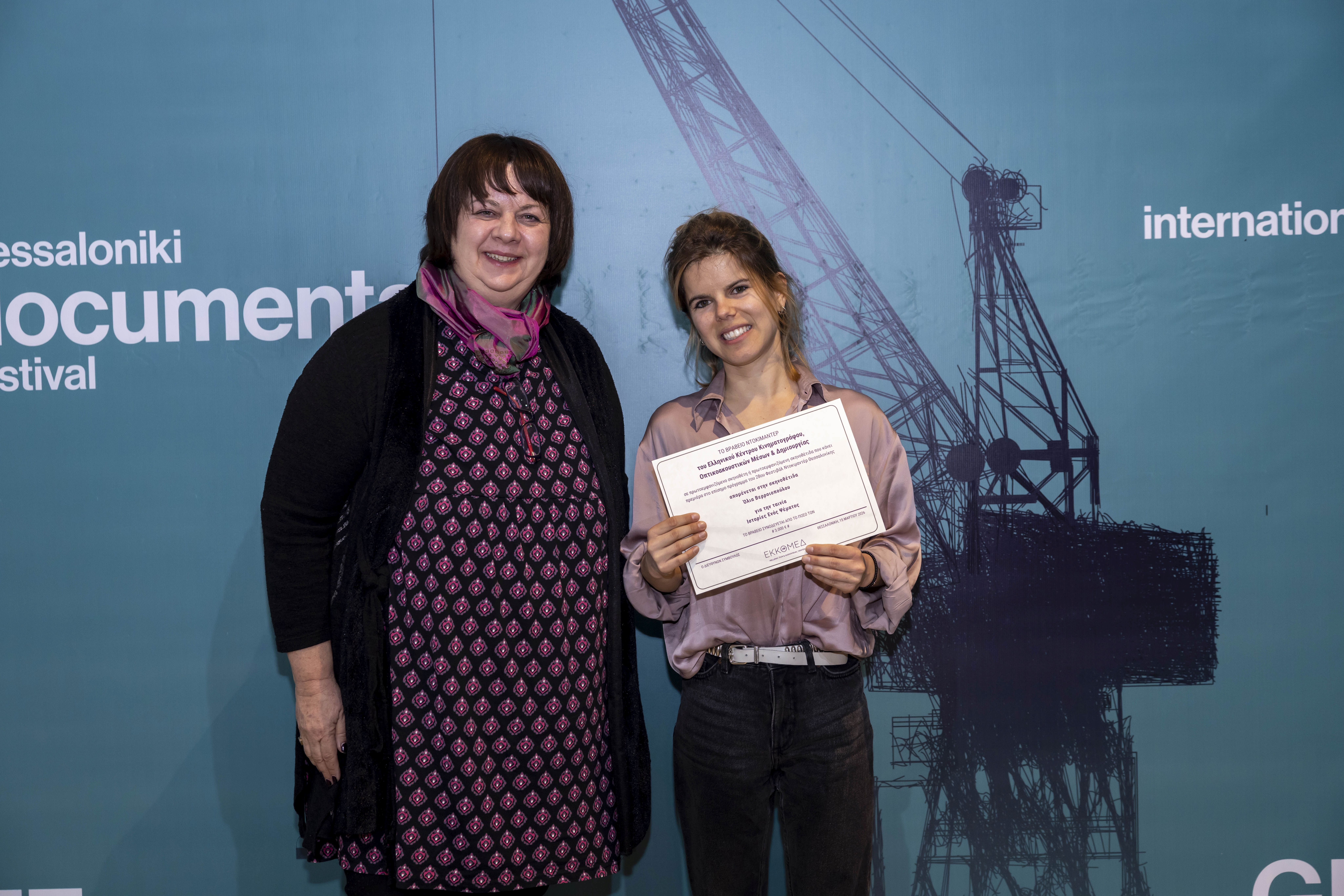 Το Βραβείο ΕΡΤ-Thessaloniki Pitching Forum, που συνοδεύεται από χρηματικό έπαθλο 2.000 ευρώ, απονεμήθηκε από τον Άρη Παναγιωτίδη, Γενικό Διευθυντή της ΕΡΤ3, στο ντοκιμαντέρ:
