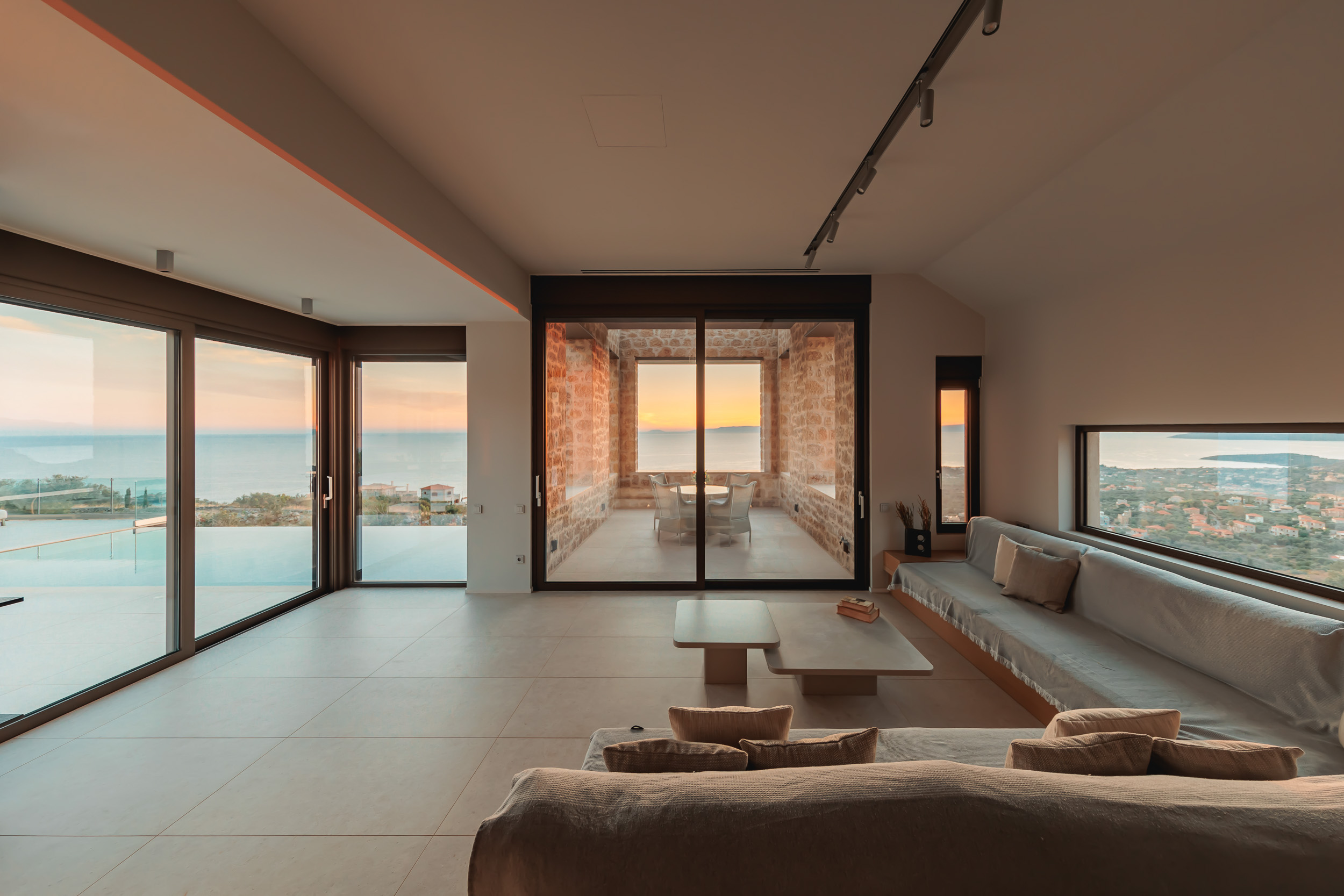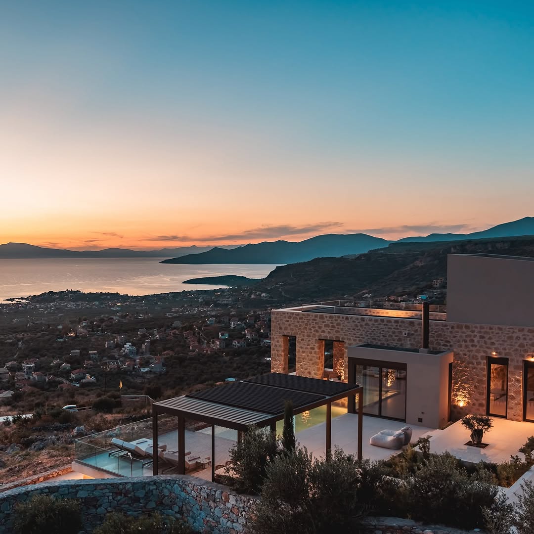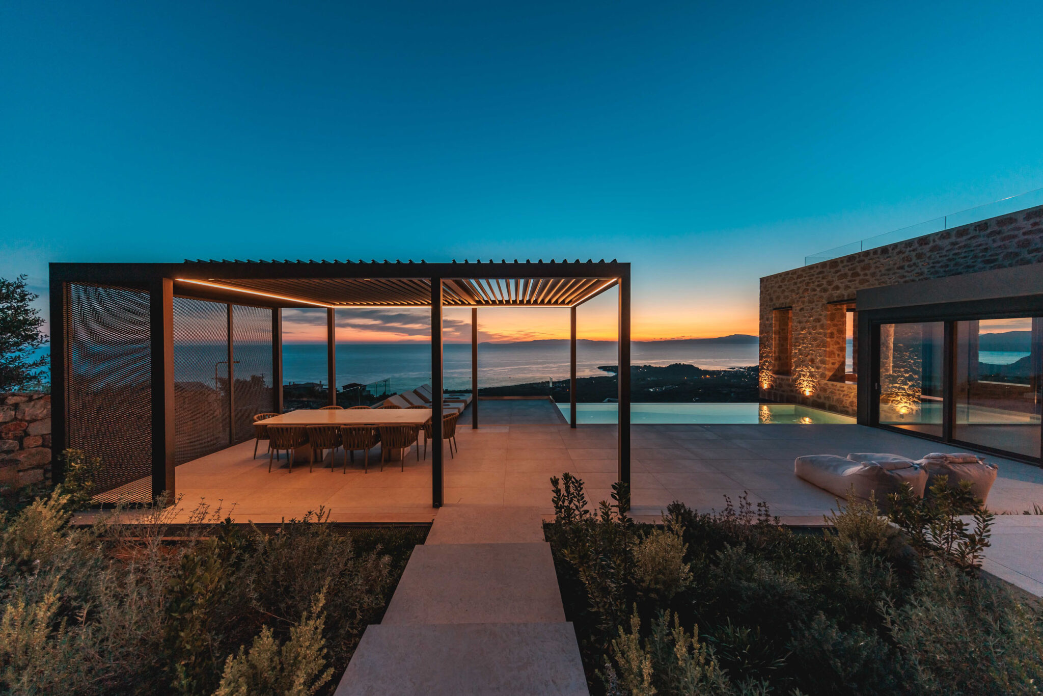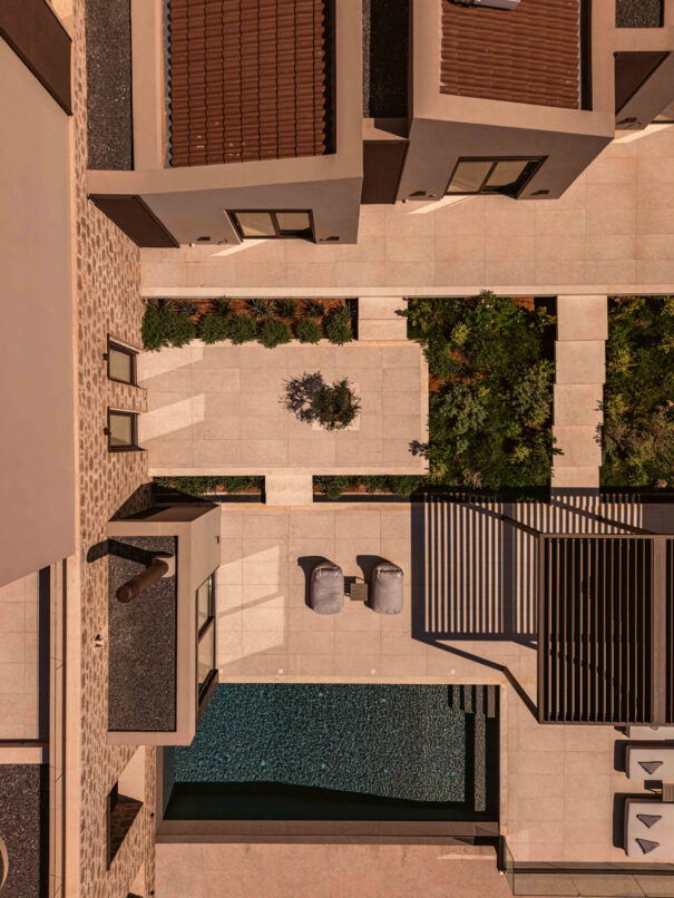 Σαν ζωγραφιά, η βίλα εκτείνεται σε 1 στρέμμα όπου κυριαρχεί η χαμηλή φύτευση. Εντυπωσιακοί εξωτερικοί χώροι καθιστικού και τραπεζαρίας, σημεία για ρεμβασμό και διάβασμα, συμπληρώνουν την ειδυλλιακή εικόνα. Μια πισίνα υπερχείλισης (infinity pool) ατενίζει τον κόσμο από το υψόμετρο των 250 μέτρων, απολαμβάνοντας τη θαλασσινή αύρα που ενώνεται με τις μυρωδιές από τα βότανα και τα θυμάρια της περιοχής.