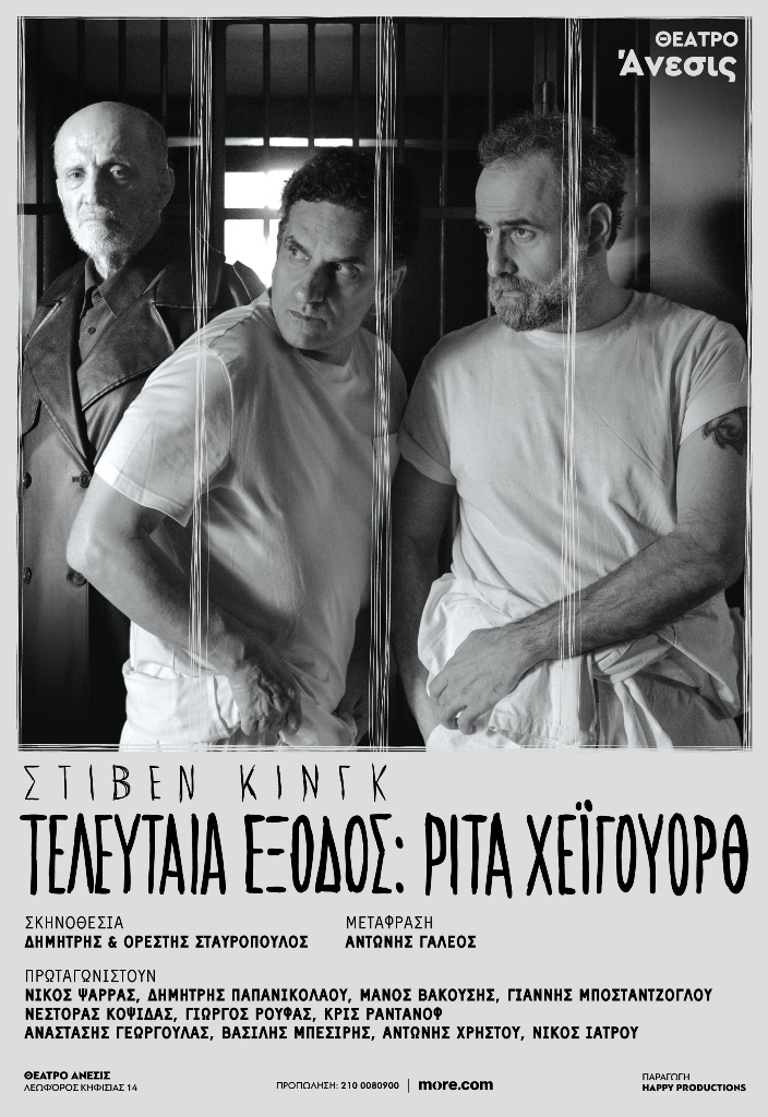 Η Happy Productions παρουσιάζει στο Θέατρο Άνεσις, για πρώτη φορά στην Ελλάδα, τη θεατρική μεταφορά της ταινίας σταθμός στην ιστορία του κινηματογράφου «Τελευταία Έξοδος – Ρίτα Χέιγουορθ» (The Shawshank Redemption), βασισμένη στο αριστούργημα του Στίβεν Κινγκ.