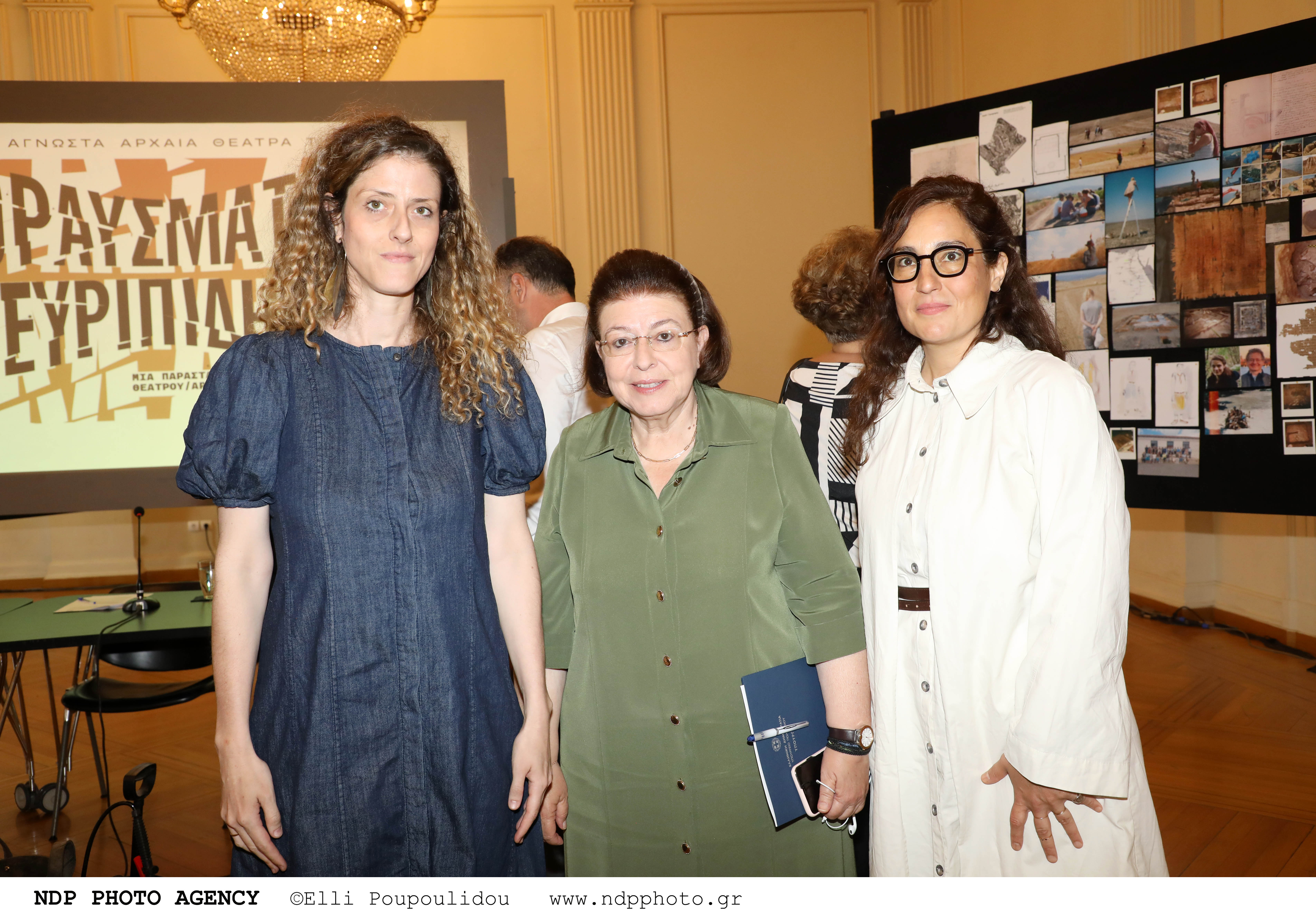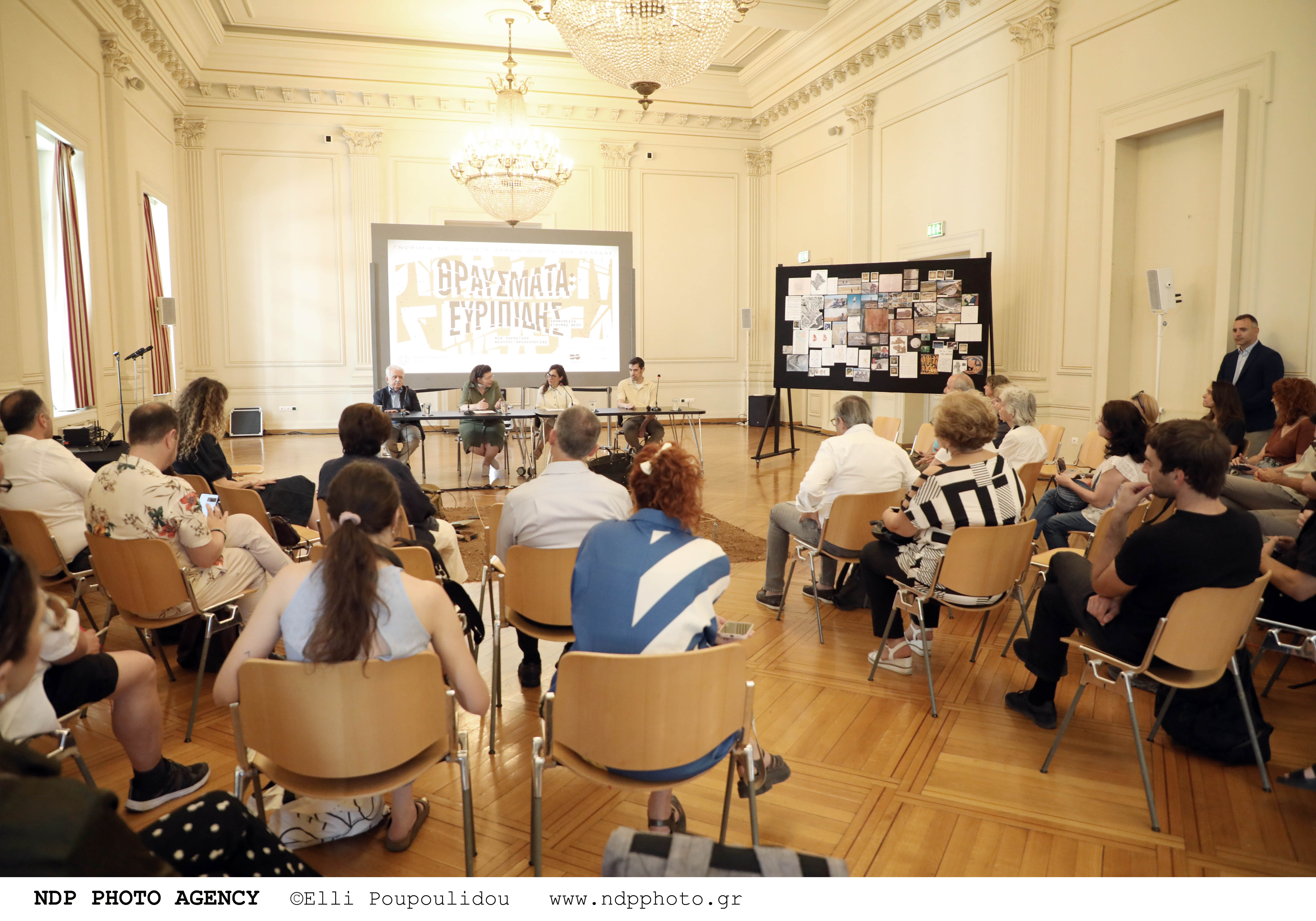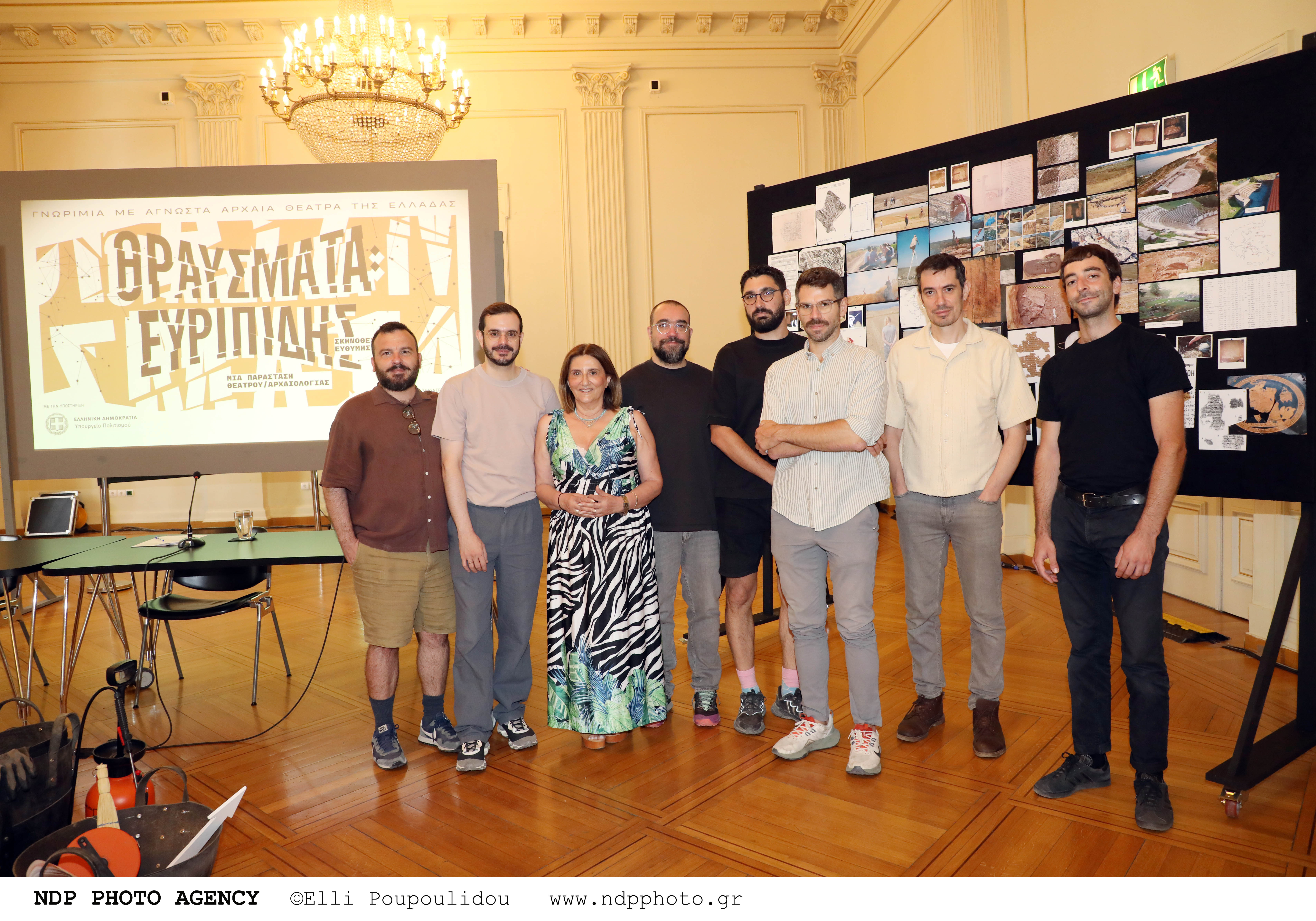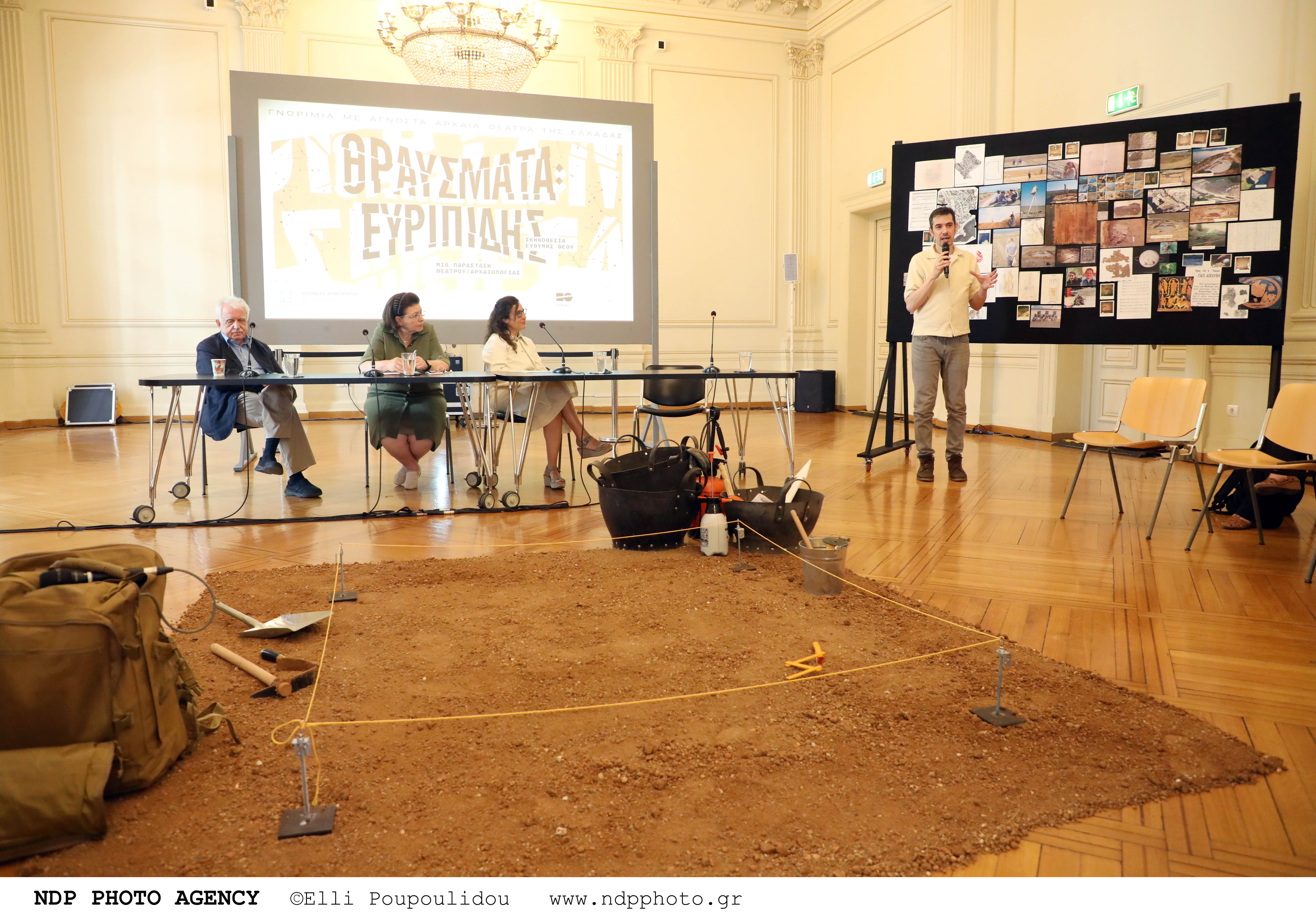 Όταν μπήκα στον χώρο προβών τους αντίκρυσα αυτόν τον πίνακα που βλέπετε εδώ, που αποτυπώνουν να δεδομένα της έρευνας της δημιουργικής ομάδας, τους σταθμούς της διαδρομής τους. Μαζί υπήρχαν, από κάτω, και γύρω στα 100 βιβλία πολλών και διαφορετικών θεματικών σε σχέση με αυτά. Πιο δίπλα ένα τραπέζι έρευνας και απέναντι το αυτοσχέδιο σημείο ανασκαφής, με την κάναβο, την περισχοίνιση και τα ζεμπίλια… Θεώρησα ότι ήταν ωραίο να μεταφέρουμε και σε εσάς τώρα την εικόνα αυτή, διότι δίνει με μια καθαρότητα το στίγμα της παράστασης.Στο σημείο αυτό να αναφέρω και μια μικρή αλλαγή ως προς τα δελτία εισόδου.Η προκράτηση θα γίνεται ηλεκτρονικά μέσω πλατφόρμας από την 1η Ιουλίου. Σας ευχαριστώ.