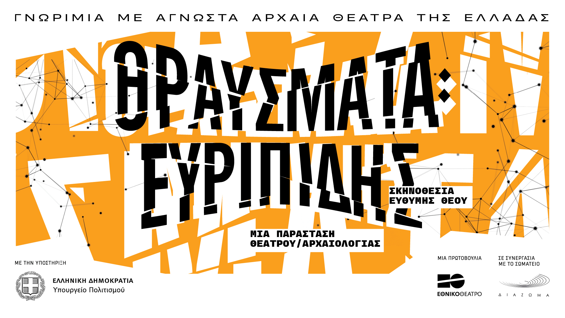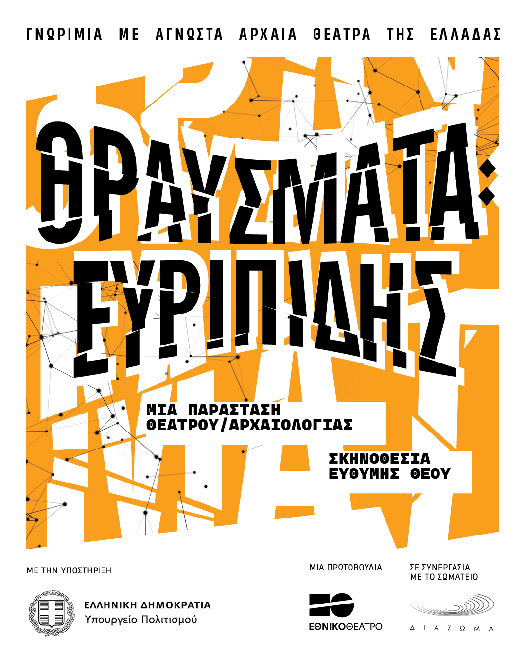 Το Εθνικό Θέατρο ως εποπτευόμενος φορέας του ΥΠΠΟ και με την υποστήριξή του, σε συνεργασία με το Σωματείο ΔΙΑΖΩΜΑ, πραγματοποιεί για 2η συνεχόμενη χρονιά το πρόγραμμα «Γνωριμία με Αρχαία Θέατρα της Ελλάδας». Η καινοτόμος αυτή δράση ανάδειξης των σωζόμενων αρχαίων θεάτρων της Ελλάδας περιλαμβάνει φέτος περιοδεία της παραγωγής «ΘΡΑΥΣΜΑΤΑ: Ευριπίδης», μια παράσταση θεάτρου/αρχαιολογίας, σε σκηνοθεσία Ευθύμη Θέου, με τη συμμετοχή ενός θιάσου ξεχωριστών καλλιτεχνών του ελληνικού θεάτρου.