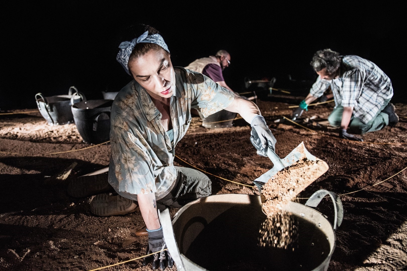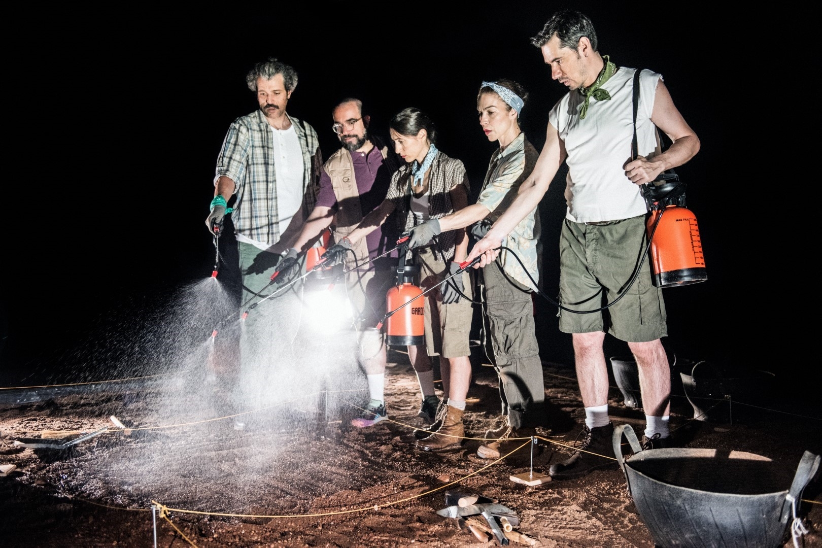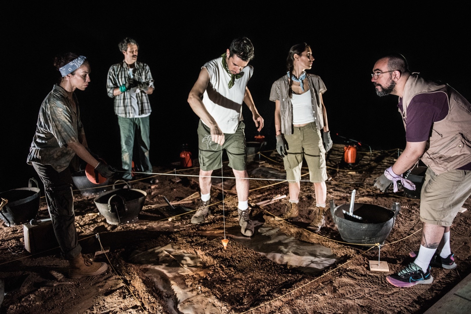 Στη σκηνή στήνεται μια παράδοξη, υπαρξιακή ανασκαφή που τα ευρήματά της δεν είναι, αυτή τη φορά, αγγεία ή αρχιτεκτονήματα, αλλά θεατρικοί στίχοι, λόγια αρχαίων ηθοποιών, σπασμένα σε μικρά κομμάτια. Πέντε ερμηνευτές/αρχαιολόγοι, εφοδιασμένοι με σκαλιδάκια, πινελάκια, κόσκινα και τριγωνάκια, σκάβουν κάτω από τον ήλιο, ακολουθώντας τη σχεδόν τελετουργική διαδικασία μιας αρχαιολογικής ανασκαφής, όπως αυτή εξελίσσεται κατά τη διάρκεια μιας ημέρας. Και μέσα από τα σκάμματά τους ξεπηδούν στιγμιότυπα αρχαίων παραστάσεων και λεπτομέρειες της καθημερινής ζωής των θεάτρων, όπου θα πραγματοποιηθεί το έργο.