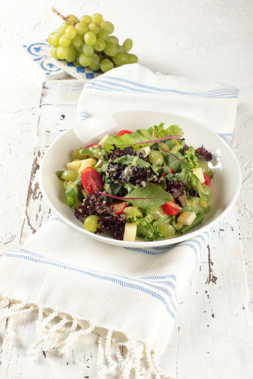 με μαρούλι, ρόκα, σπανάκι, λόλες, παντζαρόφυλλα, τοματίνα, σταφύλι & γραβιέρα