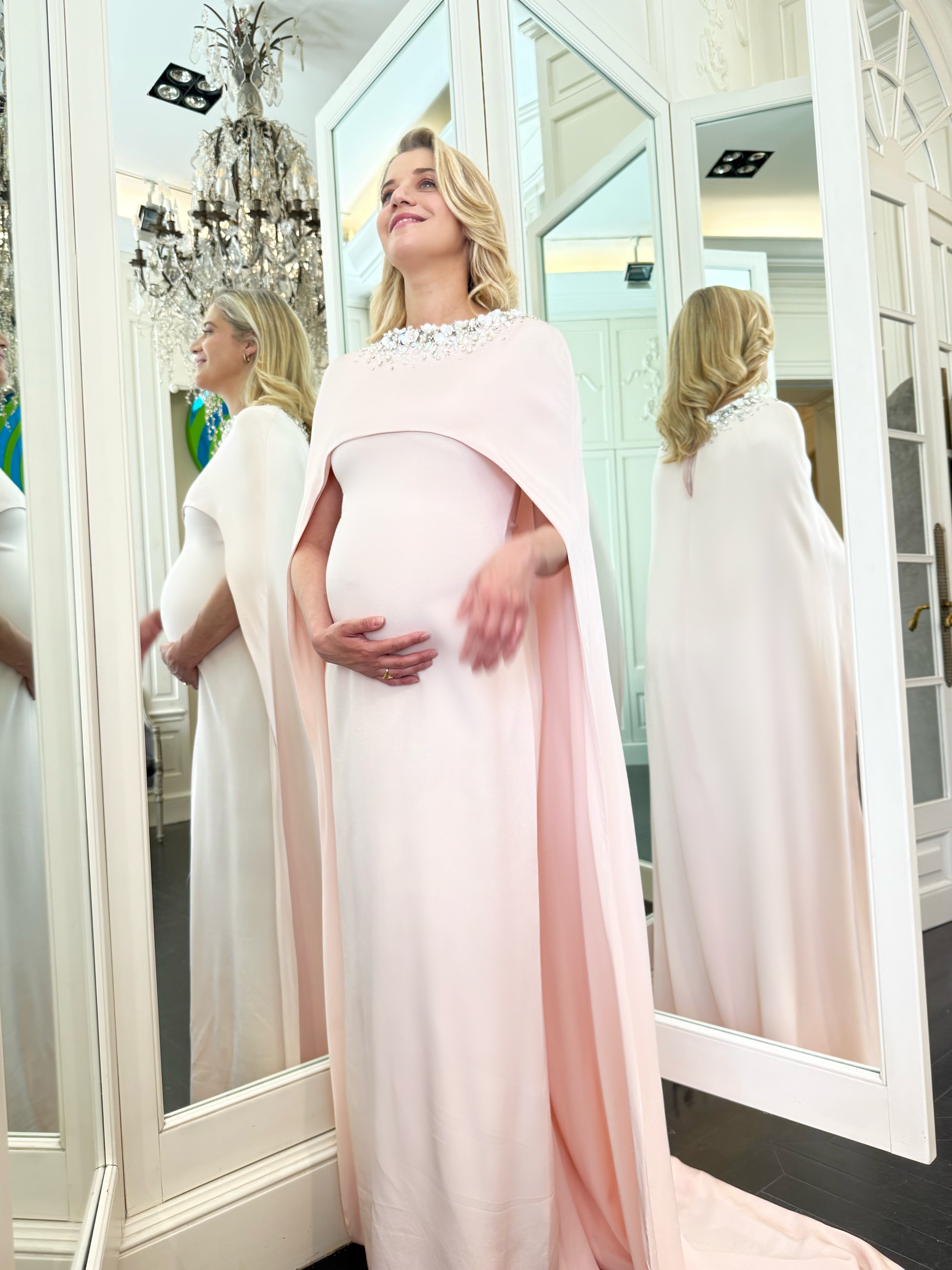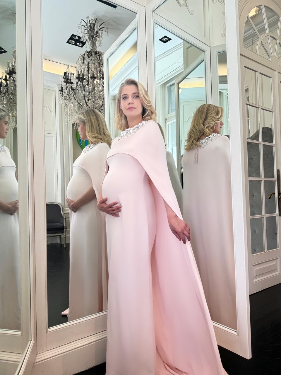 Η Τζένη Θεωνά, η οποία διανύει τον πέμπτο μήνα της εγκυμοσύνης της, επέλεξε μια ξεχωριστή δημιουργία του ιστορικού Οίκου CeliaKritharioti. Πρόκειται για ένα απαλό ροζ φόρεμα σε συνδυασμό με μια εντυπωσιακή, χειροποίητη κεντημένη κάπα, διακοσμημένη με λουλούδια και λαμπερά κρύσταλλα. Ένα look που απέπνεε ρομαντισμό, κομψότητα και συμβολισμό, αναδεικνύοντας τη σύγχρονη γυναικεία θηλυκότητα μέσα από την τέχνη της υψηλής ραπτικής.