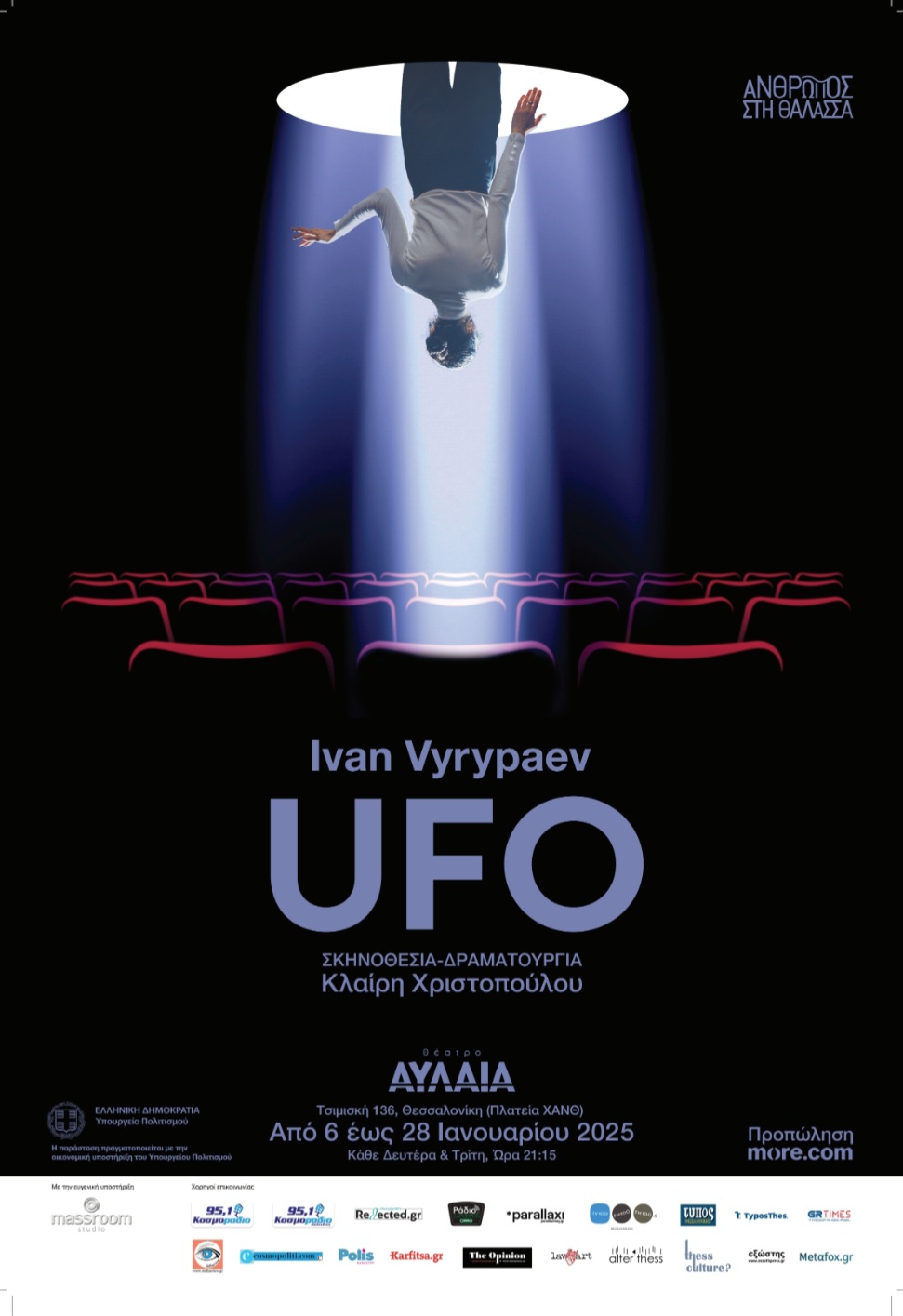 Σε πανελλήνια πρεμιέρα το θεατρικό κοινό της Θεσσαλονίκης υποδέχτηκε το θεατρικό έργο του Ivan Vyrypaev “UFO”, σε σκηνοθεσία Κλαίρης Χριστοπούλου, στο θέατρο Αυλαία.