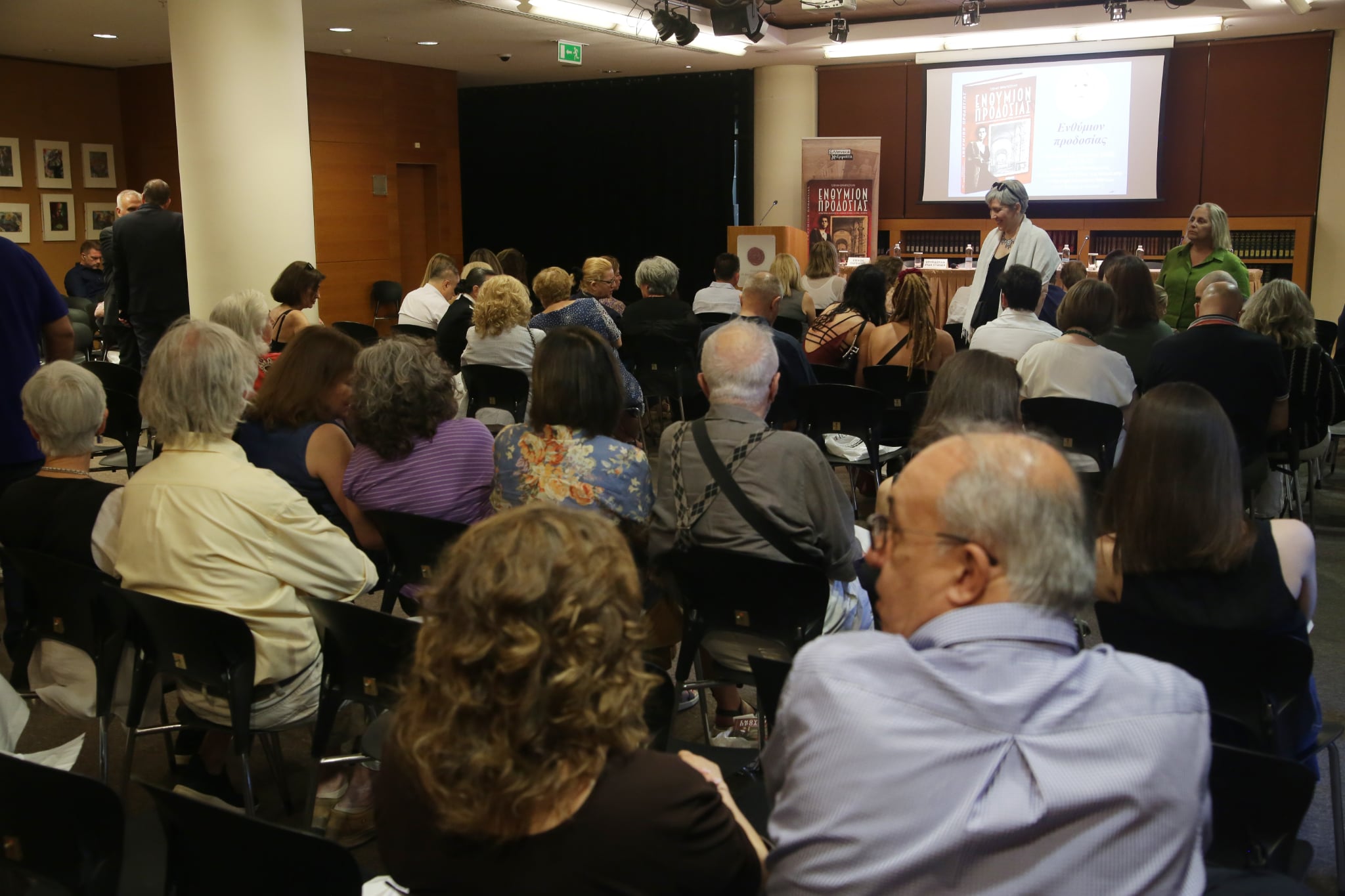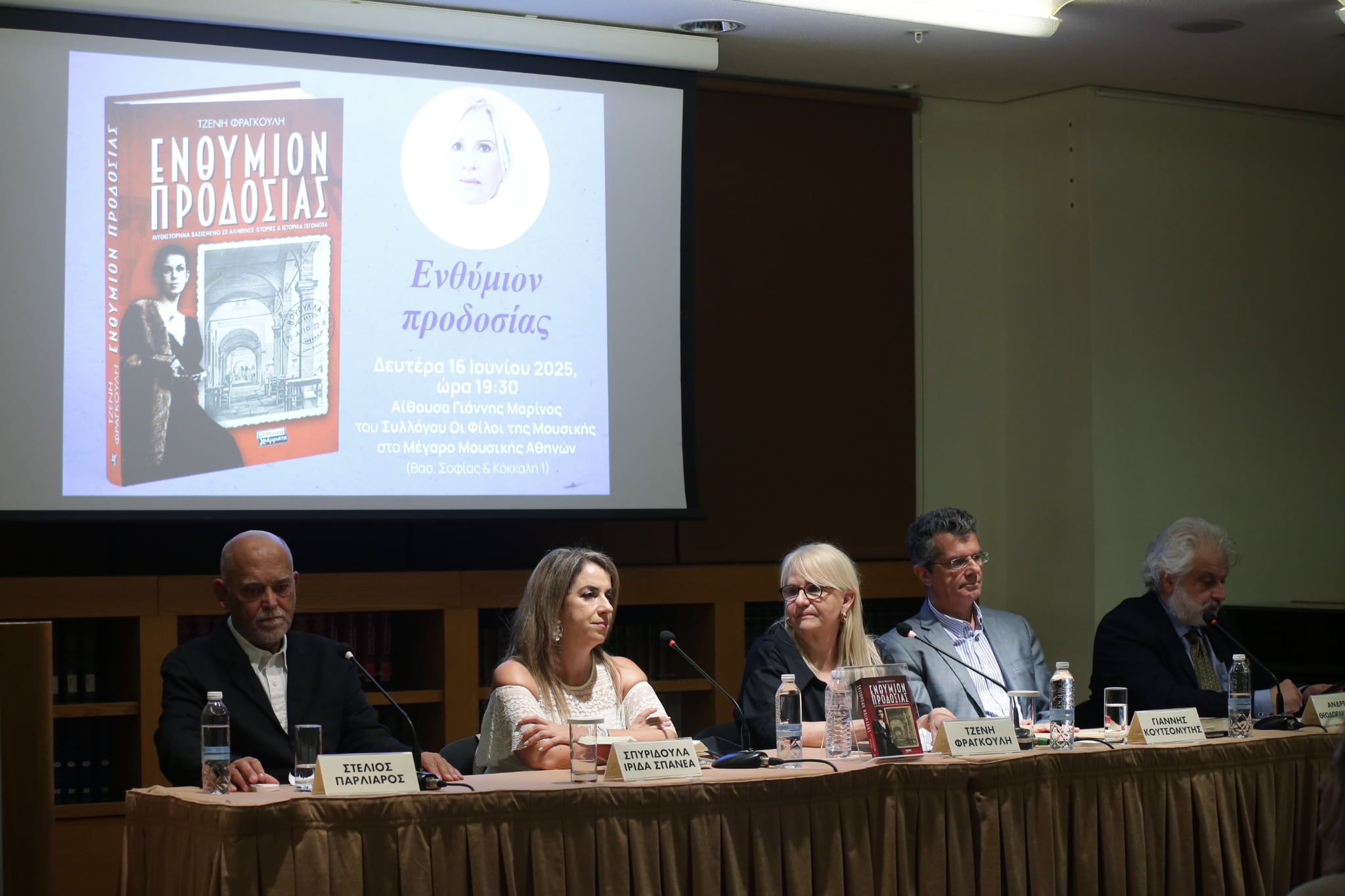 Στην αίθουσα Γιάννης Μαρίνος του Συλλόγου «Οι Φίλοι της Μουσικής» στο Μέγαρο Μουσικής Αθηνών, έγινε η πρώτη παρουσίαση του «Ενθύμιον προδοσίας» που κυκλοφορεί από τις Εκδόσεις Ελληνικά Γράμματα.
