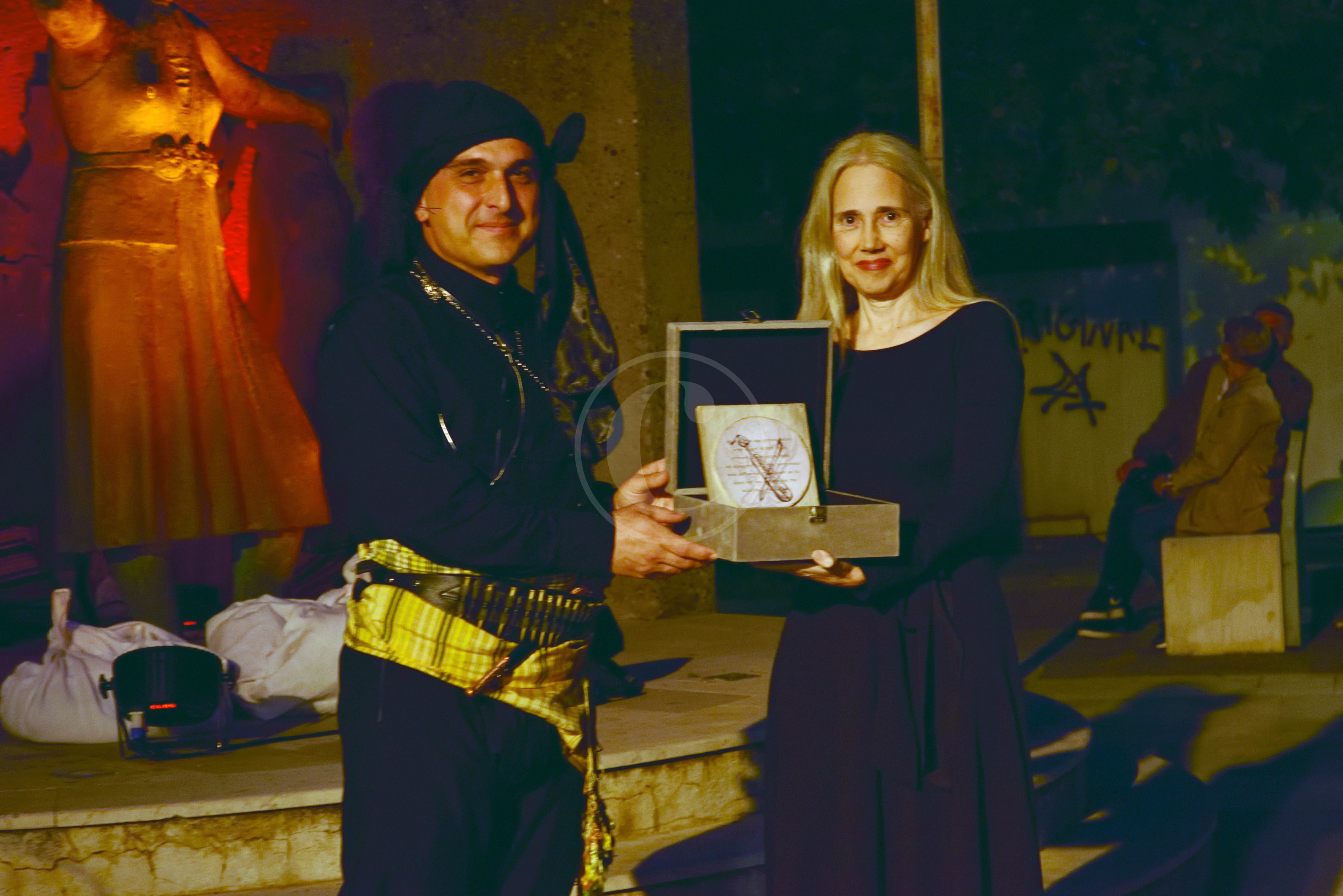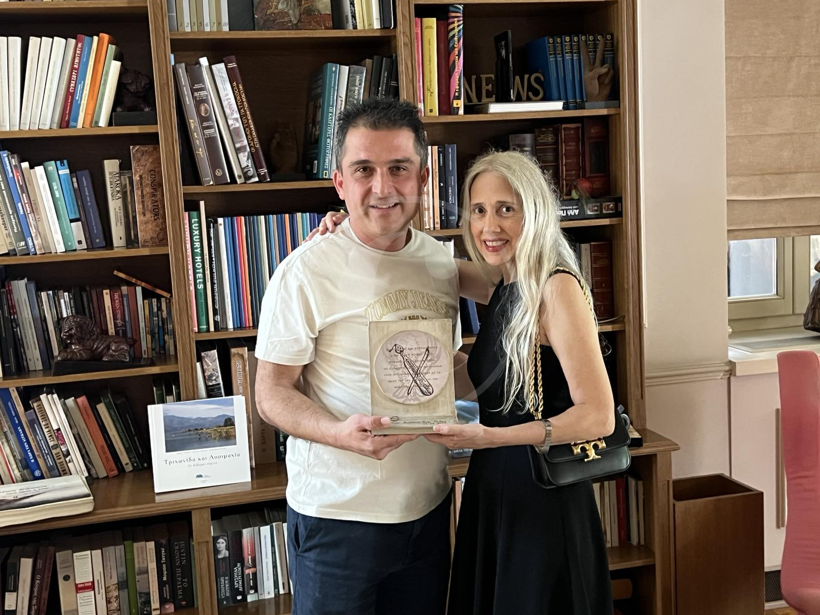 Ο πρόεδρος του Συλλόγου Ποντίων Αιτωλοακαρνανίας “Δημήτρης Ψαθάς” Αναστάσιος Μαρνέζος με την εγγονή του τιμώμενου συγγραφέα Λένα Νίτσου Ψαθά με την τιμητική πλακέτα (φωτ. Δ. Πρωτογήρου)