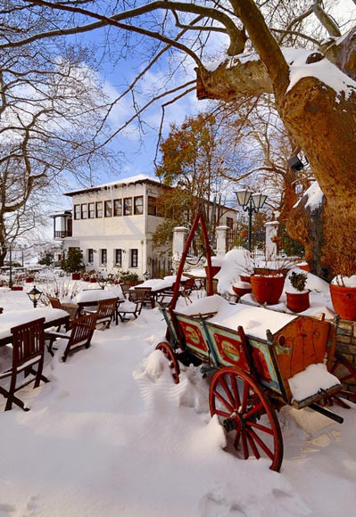 Στην κεντρική πλατεία, που έχει φορέσει τα γιορτινά της, ο αέρας μοσχοβολά από τα μελομακάρονα και τα γλυκά ταψιού που φτιάχνουν οι γυναίκες του Συνεταιρισμού, αλλά και από τις πηλιορείτικες σπεσιαλιτέ που μαγειρεύουν με μεράκι οι αδερφές Καραΐσκου στου Κρίτσα. Το χιόνι παραμένει επί μήνες στα Χάνια και στην κορυφή Αγριόλευκες, που κατακλύζεται από σκιέρ, ενώ η πυκνή ομίχλη είναι σχεδόν μόνιμο ντεκόρ.