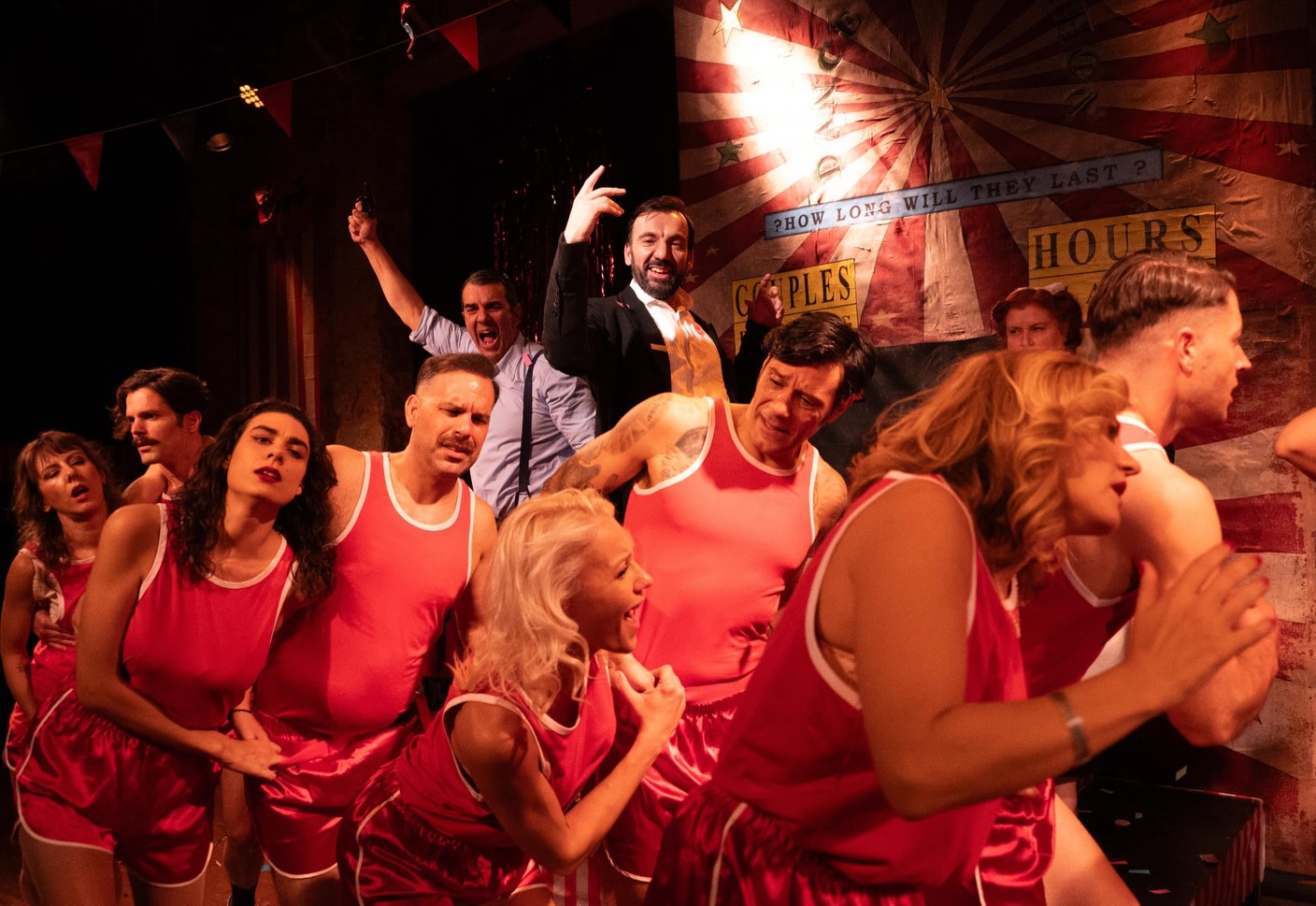 Αυτό συμβαίνει και με τα ζευγάρια του έργου. “Χορέψτε, χορέψτε” προτείνει στα ζευγάρια ο κομπέρ. Μαζί στην πίστα του χορού, θα αγωνιστούν για τη ζωή. Και σιγά σιγά, θα έρθει η συνειδητοποίηση της φρίκης που λέγεται ζωή. Και ο καθένας θα αντιμετωπίσει αυτή τη συνειδητοποίηση διαφορετικά. Είτε συμμετέχει στο μαραθώνιο, είτε τον παρουσιάζει, είτε τον παρακολουθεί. Ο Δημήτρης Καρατζιάς με τη σκηνοθεσία του, κατορθώνει να μας κάνει συνένοχους σε αυτό το μαραθώνιο, μας τοποθετεί ως κοινό στην αρένα. Όπως συμβαίνει με την Γιάννα Σταυράκη που κάθεται ανάμεσά μας αλλά έχει ενεργό ρόλο στην παράσταση, ακόμα κι όταν δεν παίζει, μόνο με τις εκφράσεις της. Σπουδαία θεατρίνα που ο σκηνοθέτης την έχει αξιοποιήσει με τον καλύτερο τρόπο. Όπως και όλο το θίασο.