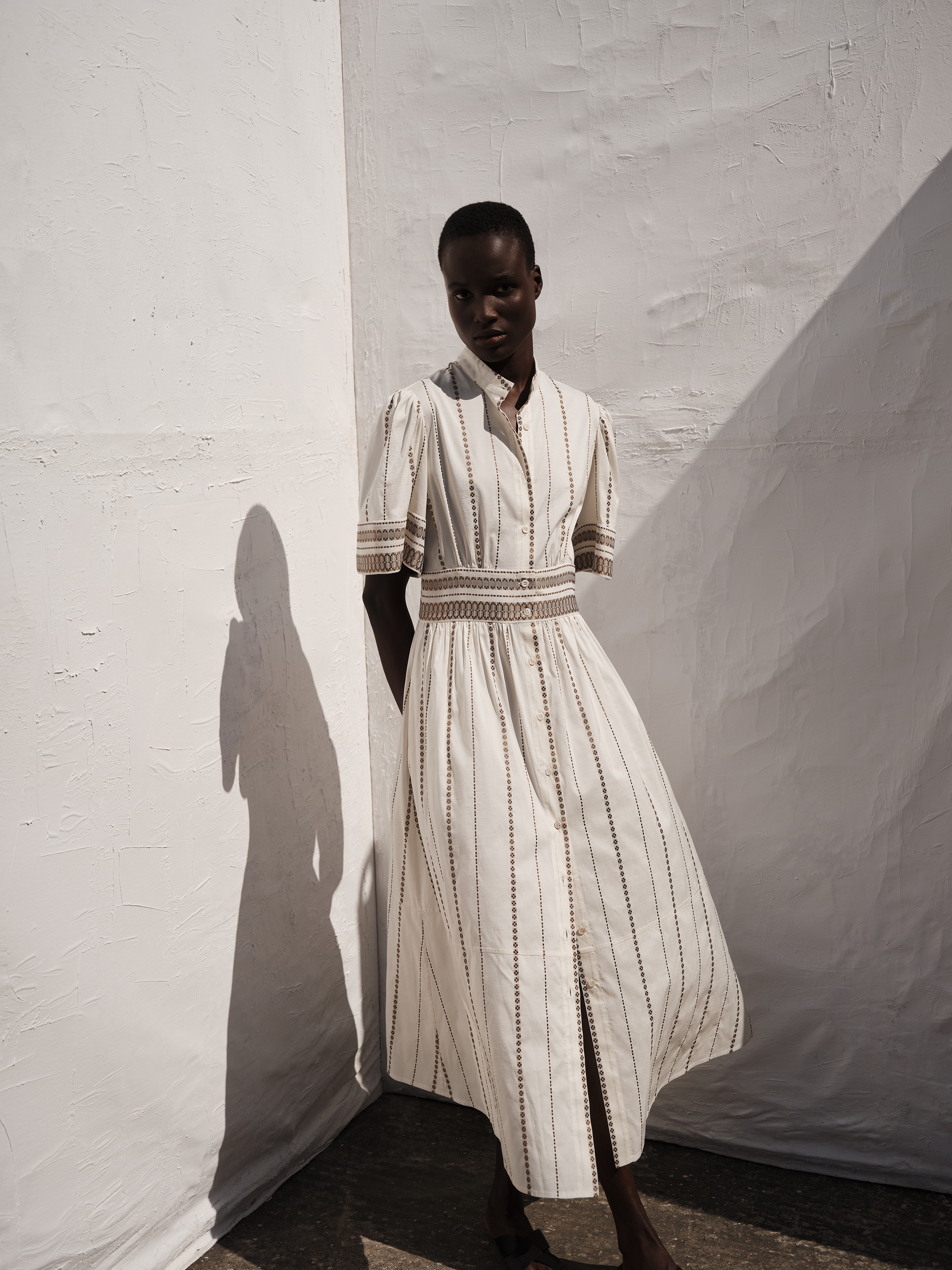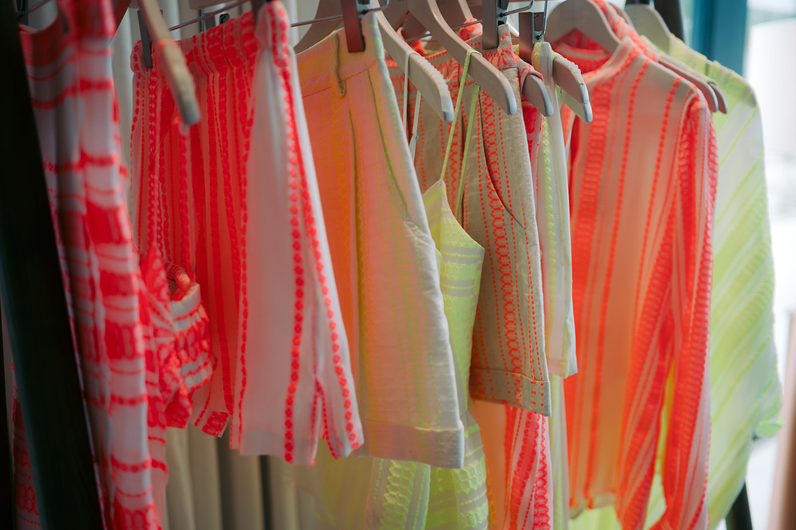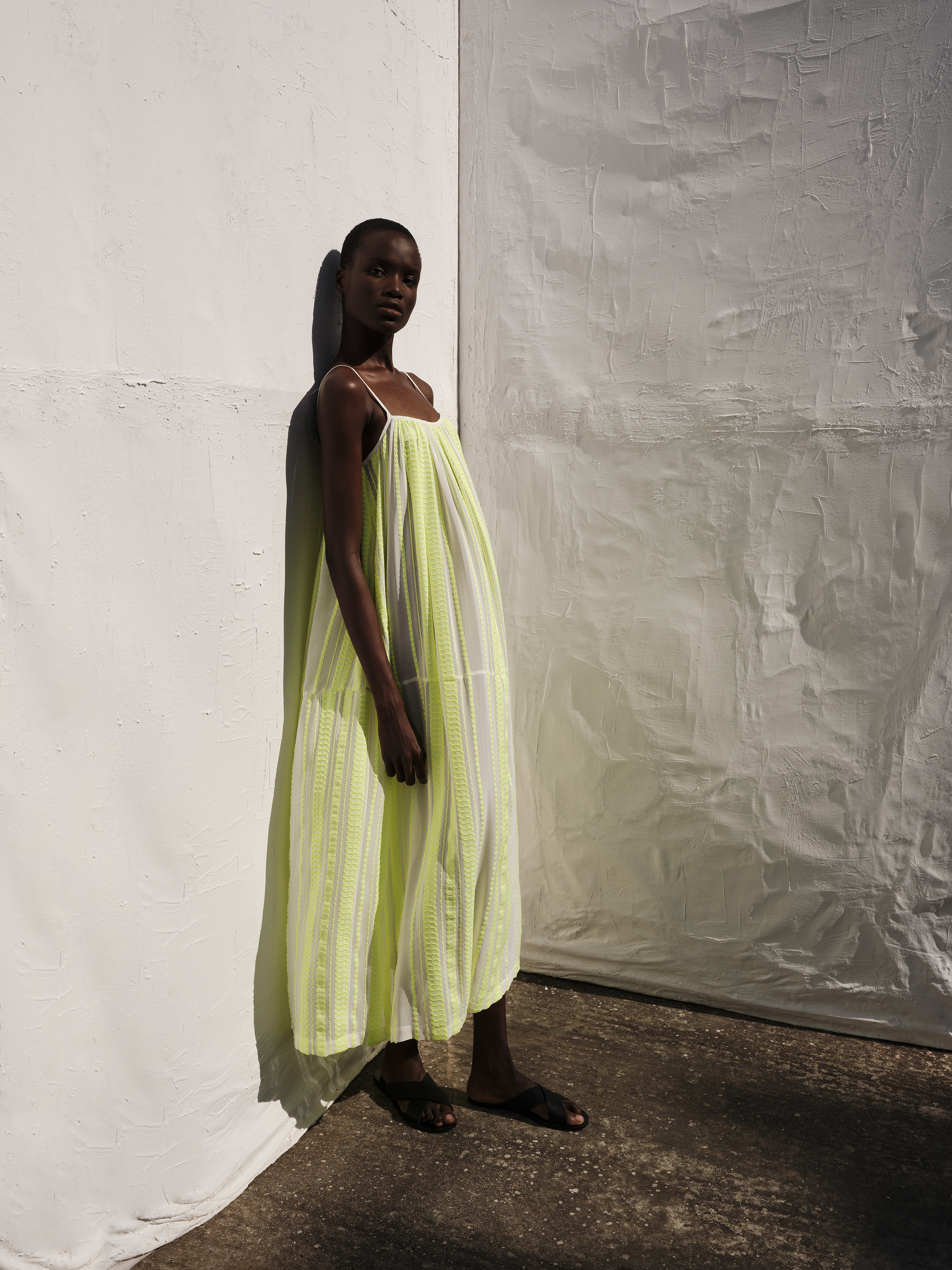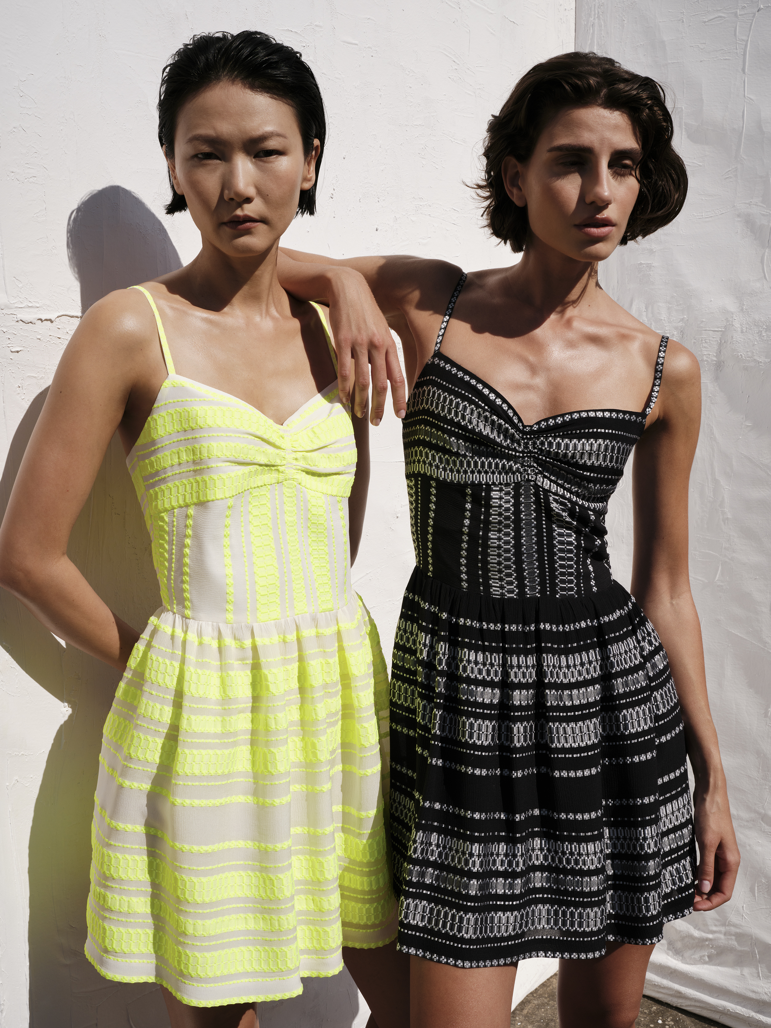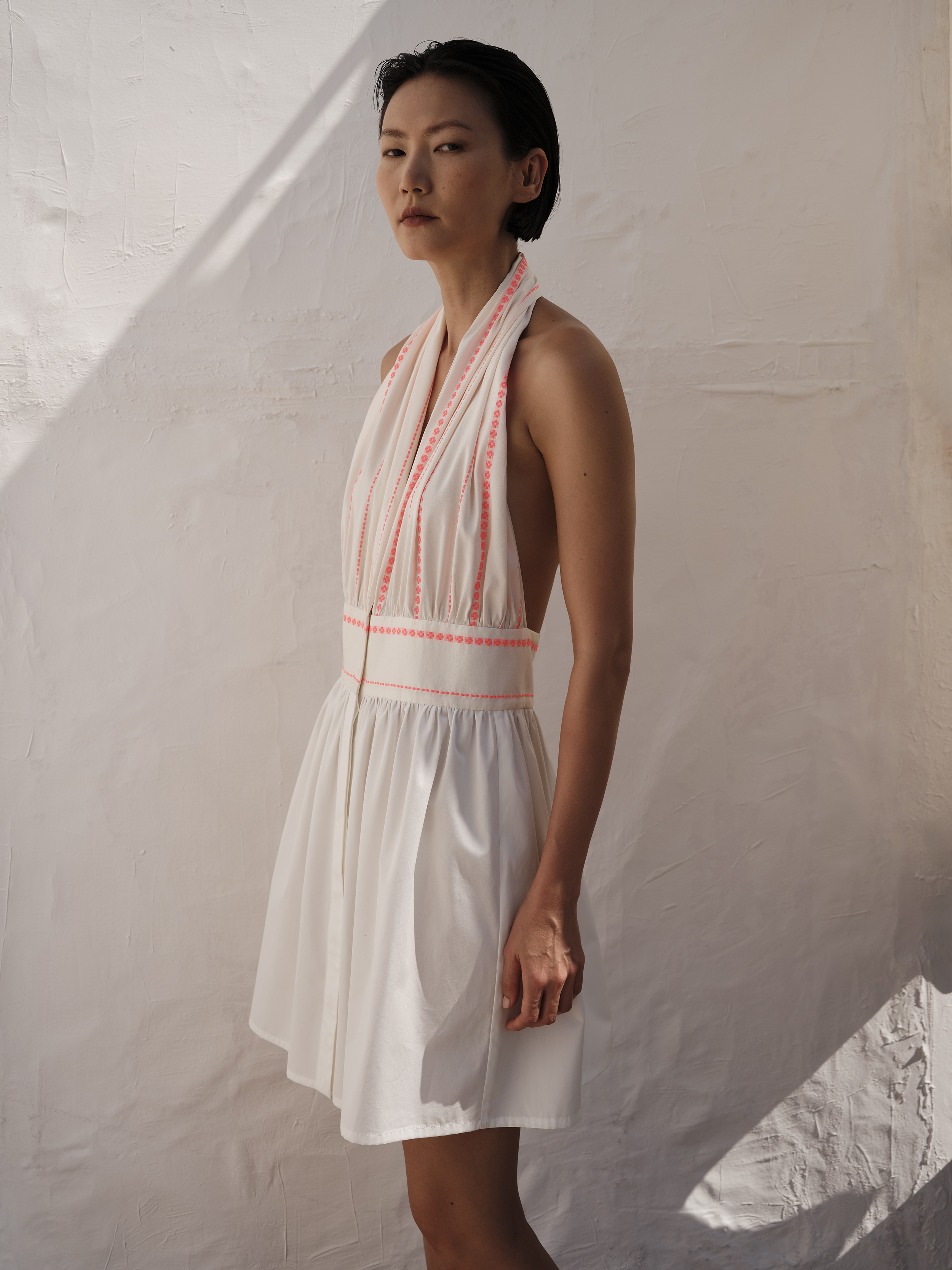 Για τον creative director Marios Schwab, η Neon Odyssey εξερευνά αυτή την ιδέα της απόδρασης, εκεί όπου η ενέργεια της πόλης συναντά την ηρεμία της φύσης. Η λέξη neon, από το ελληνικό «νέον», συμβολίζει την αρχή ενός νέου ταξιδιού• μια πορεία «προς το άγνωστο με βάρκα την ελπίδα». Η αναφορά αυτή αντλεί έμπνευση και από τη γνώριμη εικόνα της αστικής Αθήνας του παρελθόντος. Οι έντονες ροζ και κίτρινες αποχρώσεις των φωτεινών επιγραφών νέον που κάποτε φώτιζαν τους δρόμους της πόλης τη νύχτα, μεταφράζονται στη συλλογή σε μια σύγχρονη χρωματική πρόταση, σε διάλογο με μια γήινη παλέτα: ταμπά, χρυσό, απαλό ροζ, εκρού και κρεμ. Ανάμεσα σε αυτούς τους ήπιους τόνους, το neon δημιουργεί αντίθεση, κολακεύοντας την ηλιοκαμένη επιδερμίδα. Οι αποχρώσεις αυτές εμφανίζονται σε ζακάρ υφάσματα από μετάξι και βαμβακομέταξο, ενώ στη συλλογή εντάσσονται επίσης βαμβακερά υφάσματα και μείγματα βαμβακιού με λινό. Τα υλικά προσφέρουν άνεση και διακριτική πολυτέλεια, ενώ η mélange ύφανση επιτρέπει στα χρώματα να δένουν φυσικά μεταξύ τους. Το κροσέ, ένα από τα πιο χαρακτηριστικά στοιχεία της ελληνικής χειροτεχνίας, επιστρέφει στη συλλογή.